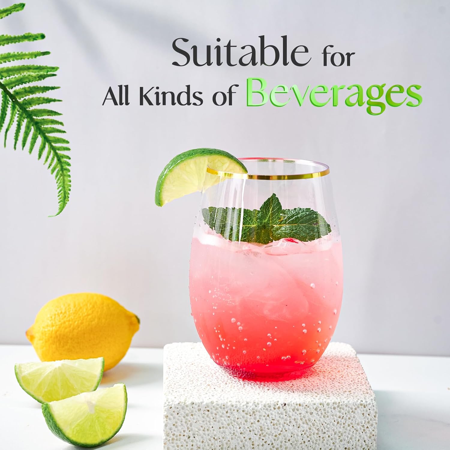 - The package includes 20 packs of 16 oz stemless gold rim plastic wine glasses, premium disposable wine glasses to save you time and effort and enjoy your event without having to worry about post party chaos