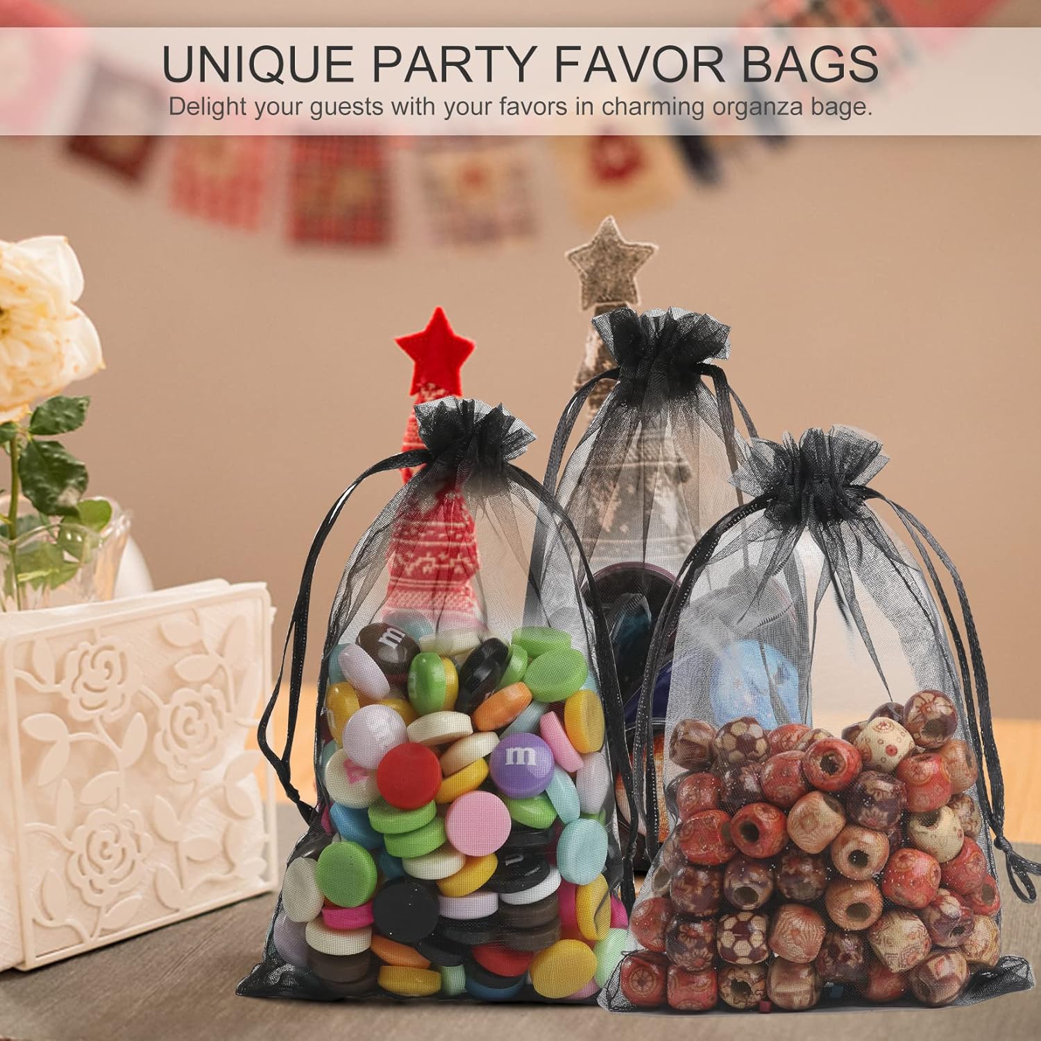 - 🎩【Advantages】 - Compared to other products on the market, our organza bags have been upgraded, touch softly and smoothly, looks more upscale and expensive. More simple and big enough to fill with treats, solve your trouble of pack little stuffs while traveling.