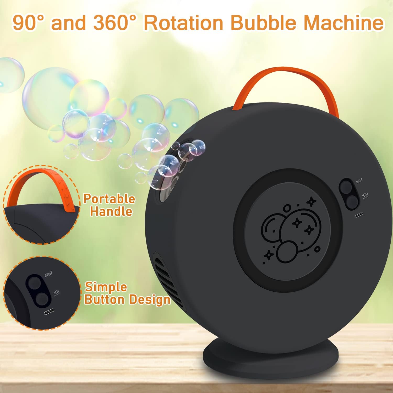 - Automatic Rotating Bubble Machine: The newest design bubble Machine can blow bubbles in a 90° & 360° rotation in addition to blowing bubbles at a standstill. The electric bubble machine are no longer traditionally blown in one direction, but surround you 360 degrees, It can blow tons of Colorful bubbles faster and further even inside with no wind. Enjoy the bubble machine indoor and outdoor with your kids, friend and pets