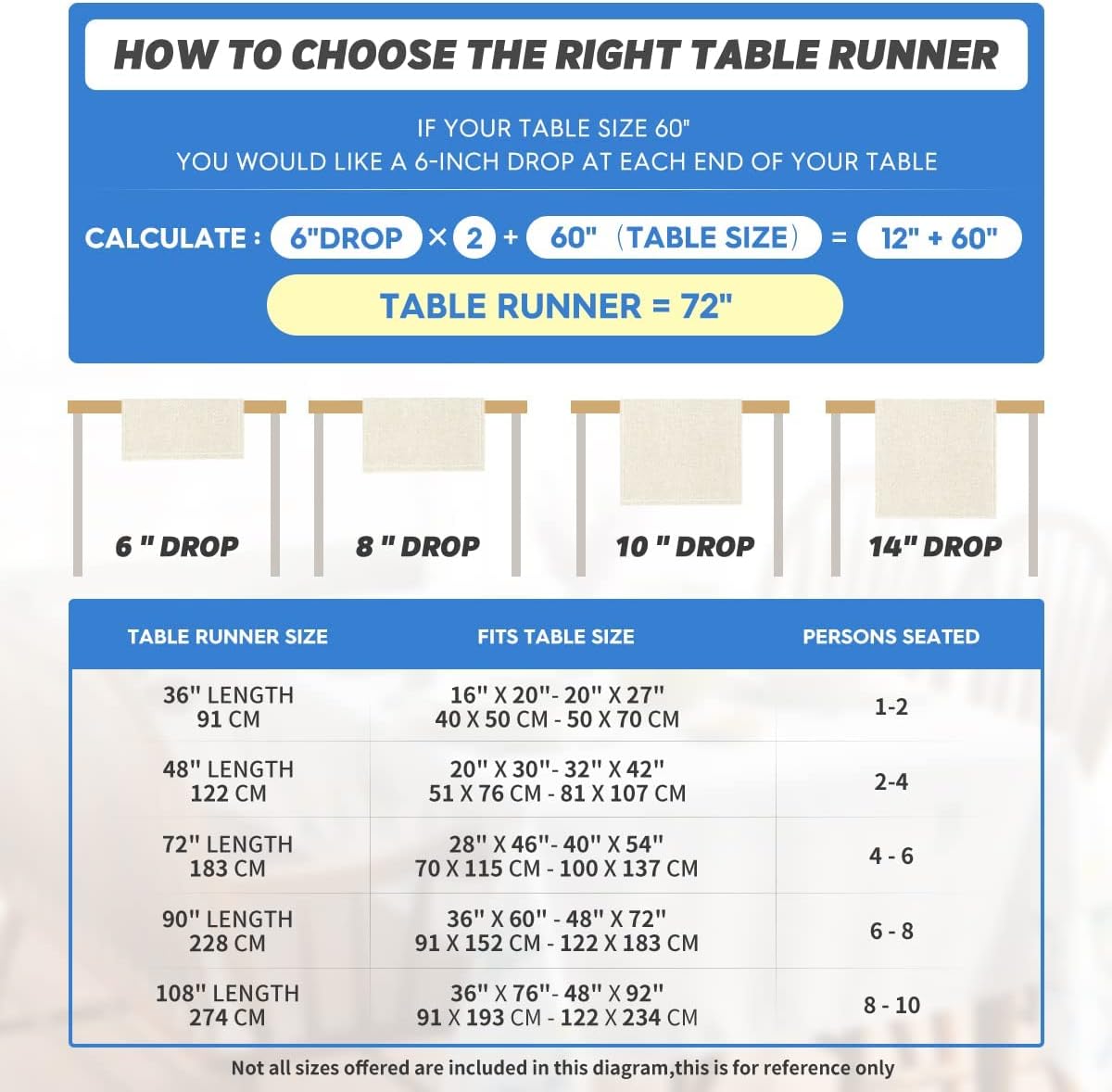 - Fits Table Size : This table runner is 13 x 36 inch, appropriate for a table that can seat 2-4 people, better match your table and give you a delightful dining experience