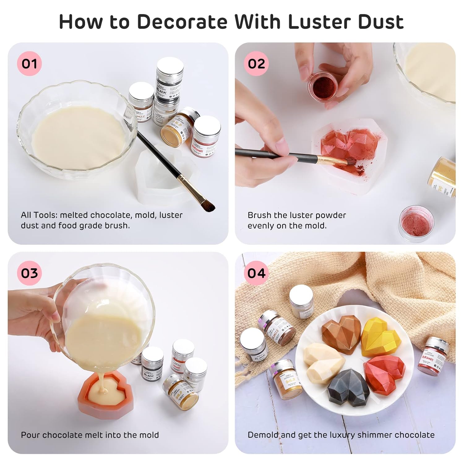 - SAFE & EDIBLE LUSTER DUST -- Adopt food grade ingredients (Mica-based Pearlescent Pigments, Titanium Dioxide), non toxic and edible, no flavor, won't change the taste of your recipe