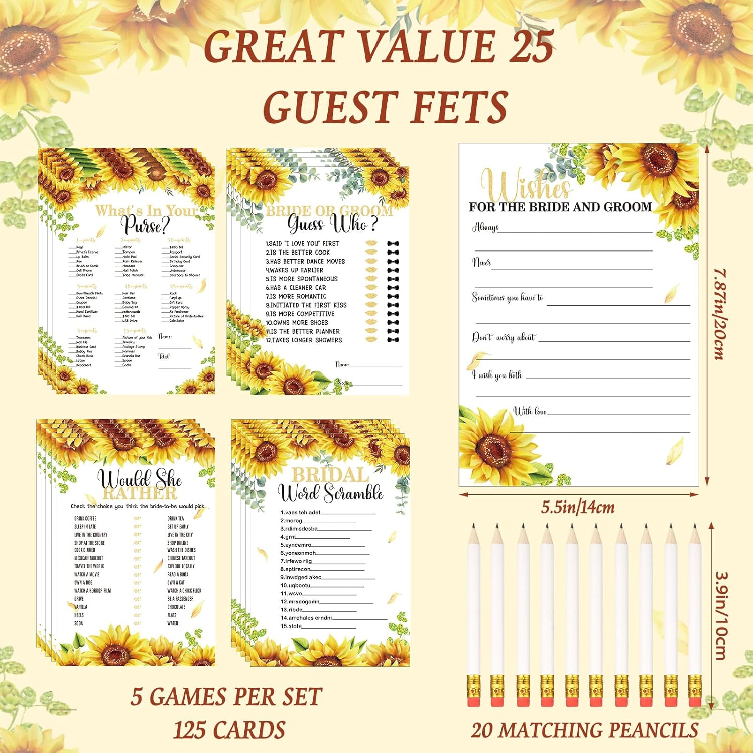 - Bridal Shower Game Kit: you will receive a total of 125 pieces of game wedding shower cards introducing 5 activities (25 each), and 20 pieces of white pencils, adequate to meet your wedding shower party favor requirement; Get ready to have fun and laughter at your wedding reception with these bridal shower games