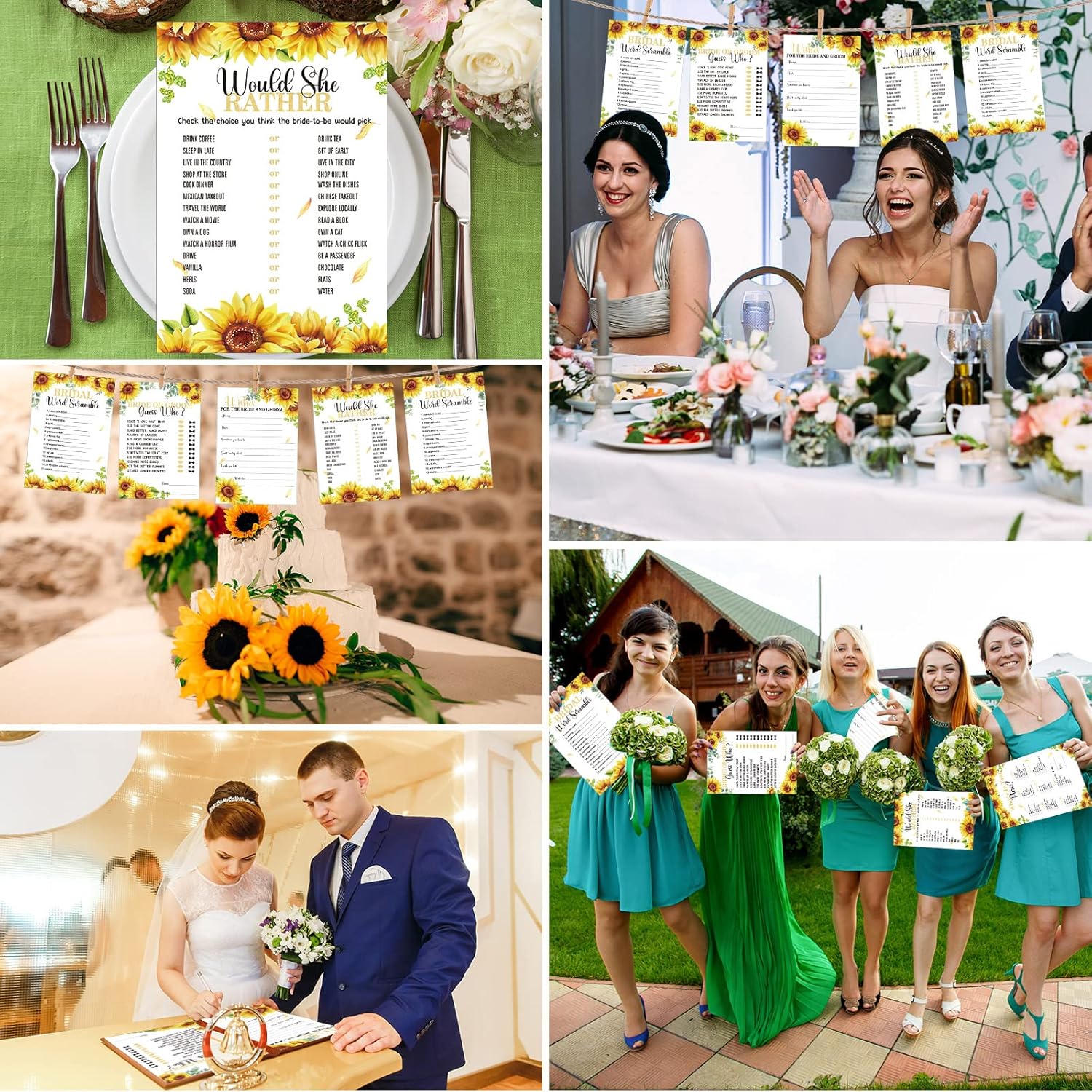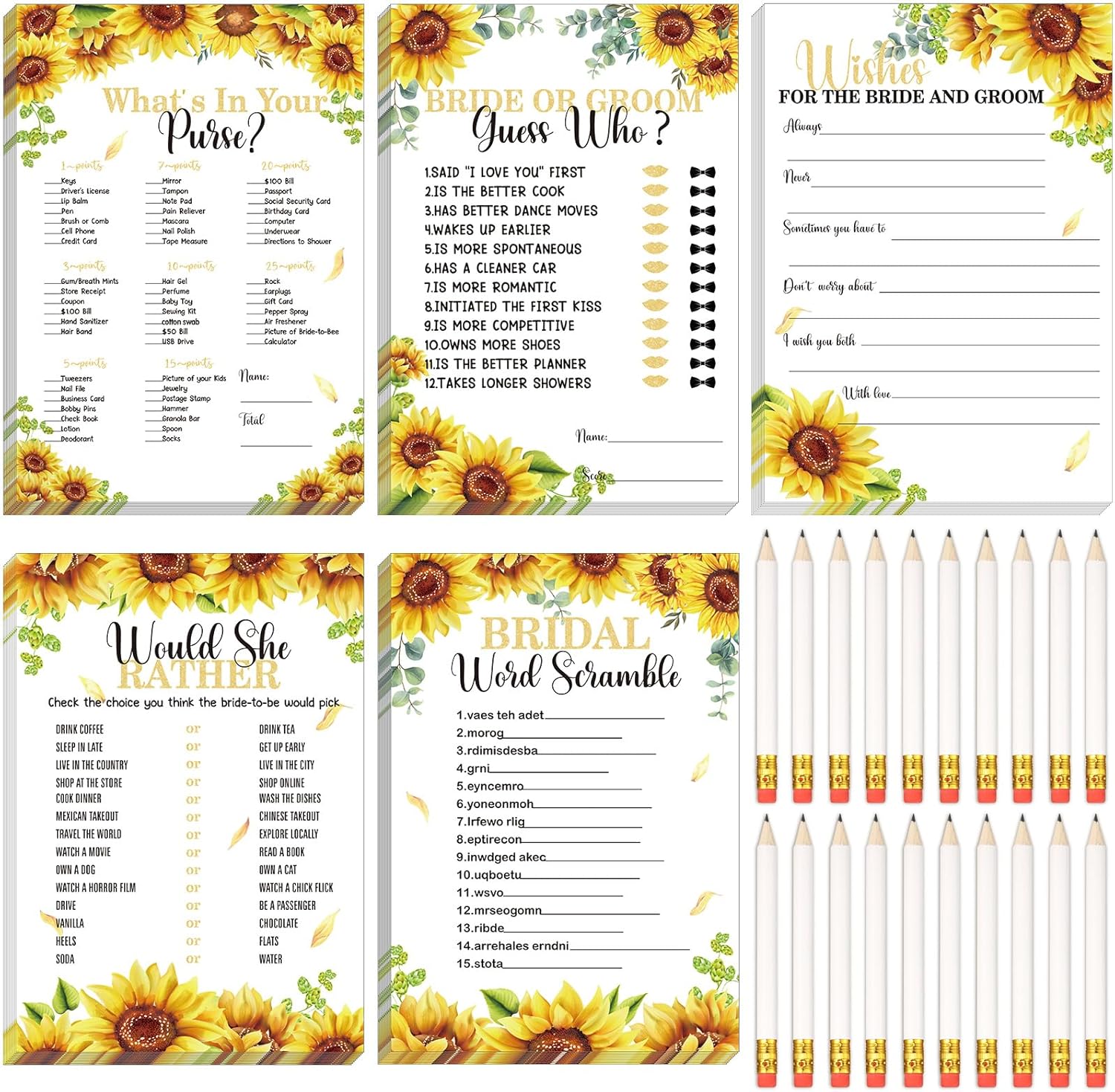 - 5 Styles of Fun Bridal Shower Games: our game bridal shower cards contain 5 fun games, including "Would She Rather", "Bride Or Groom Guess Who", "Bridal Word Scramble", "Wishes For The Bride And Groom", "What's In Your Purse"; These cards provide your guests with a fun wedding game to help them fully enjoy the party and elevate the mood