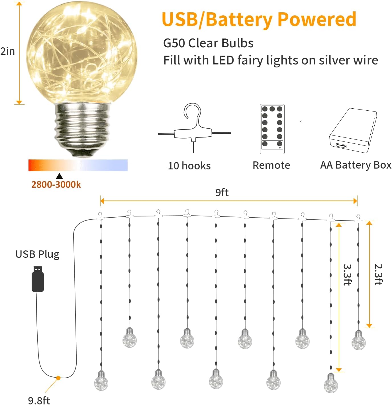 - [ 9.8 x 3.3FT ] Wishing Ball Curtain Lights: The edison look bulbs are filled with fairy-like copper wire LEDs, hanging on silver wire curtain lights, to create a soft mode for just any place, add charm and character to your activities and provide relaxing mood lighting for party & holiday