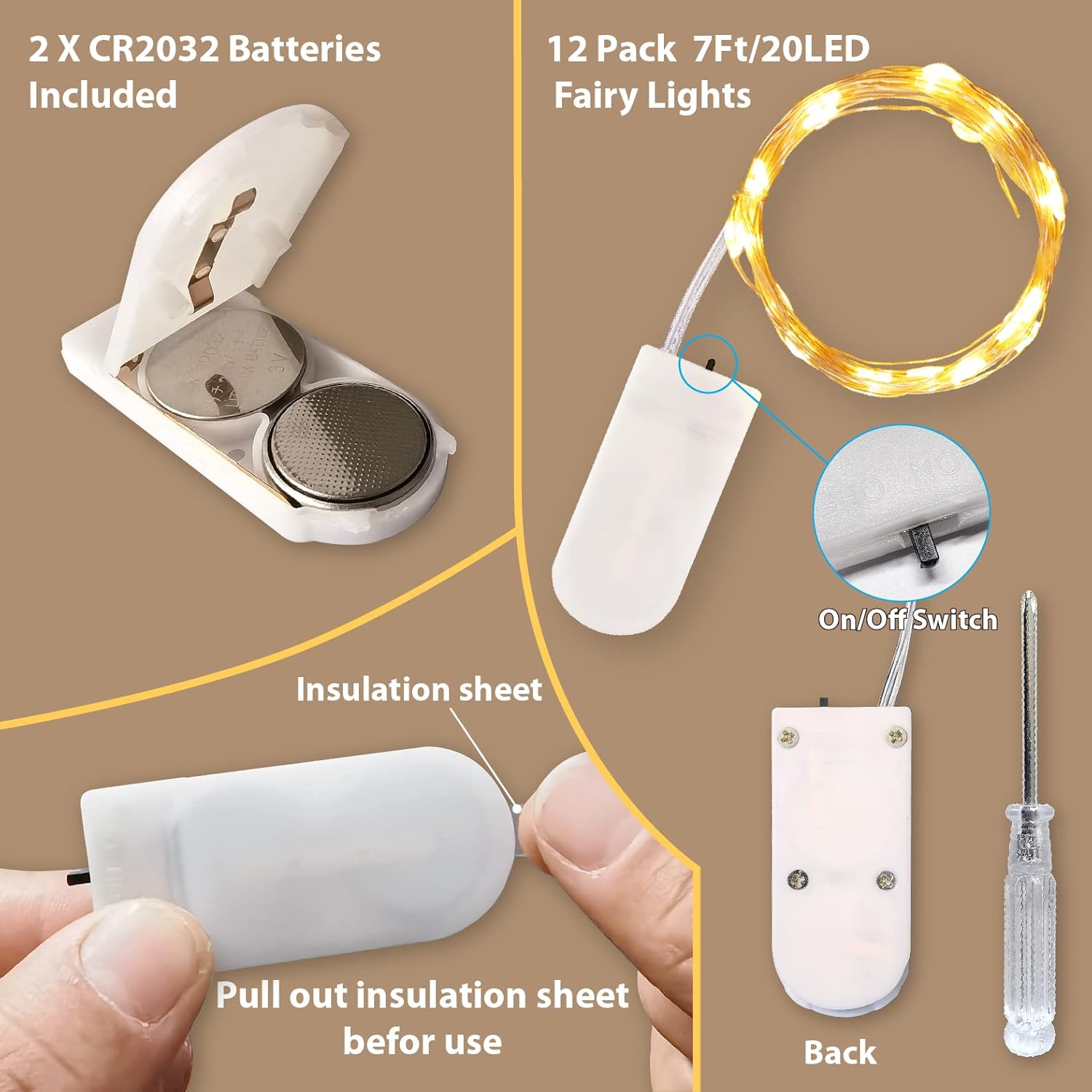 - ăBattery Poweredă: Each set of lights powered by 2X CR2032 batteries( included and can be replaced). Although these support more than 72 hours continuous working, the actual use time will vary with the temperature and humidity of the environment. Small battery case (2*1 inches) is with on/off switch, very easy to hide into your design works. These are great for themed parties, sleepovers, or center pieces. Screwdriver included for easy operation.