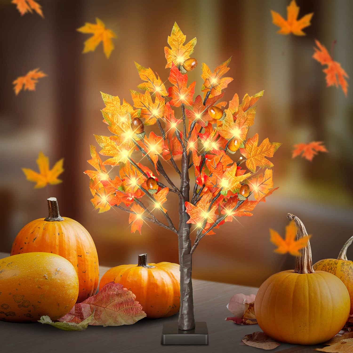24 Inch Lighted Maple Tree with 36 Lights, 6 Acorn, Timer Battery Operated Tabletop Artificial Fall Tree for Thanksgiving Harvest Home Decor, Fall Table Centerpiece Decorations