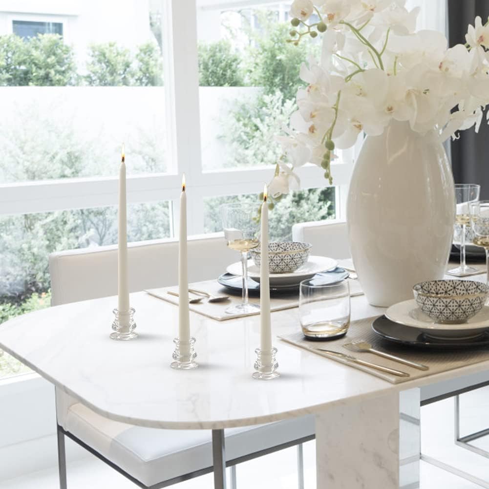 - TAPER CANDLE HOLDERS--【SAFE MATERIAL】IYOUYA candle holders are made of high precision glass, sturdy construction, not fragile, smooth. The thickened, weighted and widened base can prevent it from tipping over, overheating and cracking during use.If the candle won't stand up straight, you can drip the wax into the hole and adjust the candle.And using a hot rag to soften the wax drops will be easier to clean.