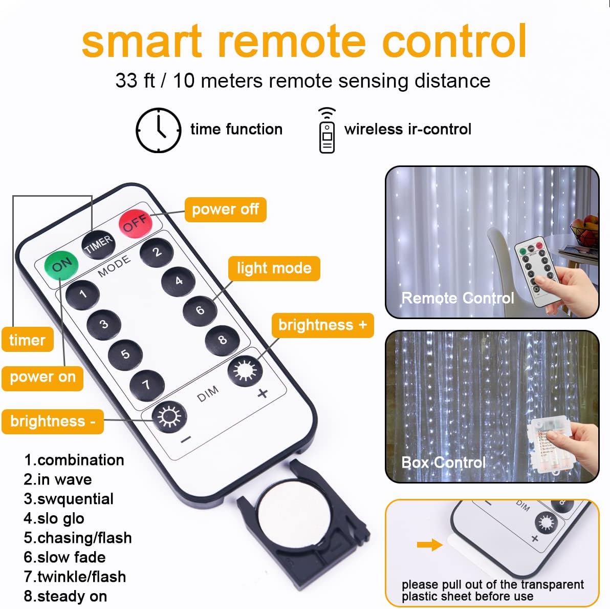 - 💡【8 Modes & Timing Function】The Christmas string chandelier contains 8 lighting modes: Combination, Wave, Sequential, Slow Glow, Chase/Flash, Slow Fade, Blink/Flash and Steady on. With the one-button wireless remote control in your hand, when you press the "timer" button on the remote control, the decorative light will turn on for 6 hours and turn off for 18 hours. Curtain string lights create a festive atmosphere for family and friends.