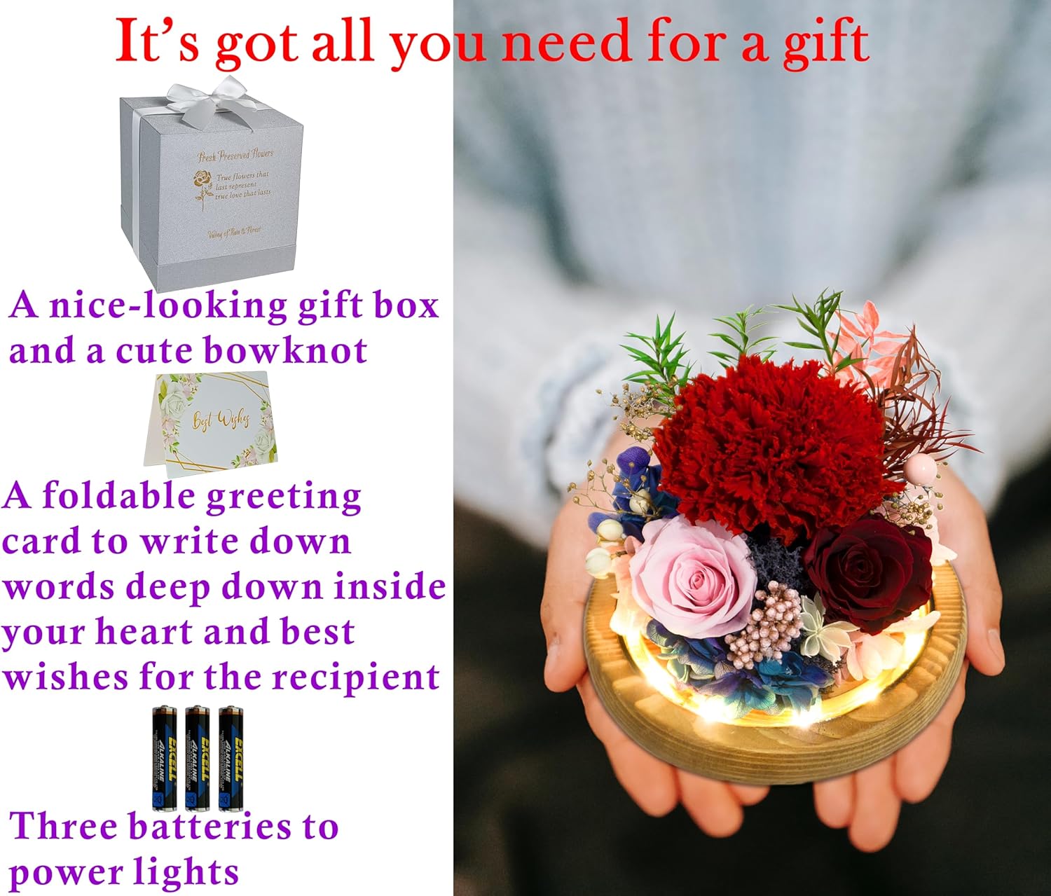- ♥Please note♥:1. Due to the delicateness of natural flowers, opening the glass dome is not recommended as it can lead to unintended damage to the flowers. 2. Since these are real flowers crafted by hand and not mass-produced by machine, there may be slight variations in certain cases. 3. loose and incorrect battery insert will result in lights not turning on. If that's the case, simply remove the batteries and reinsert them correctly.