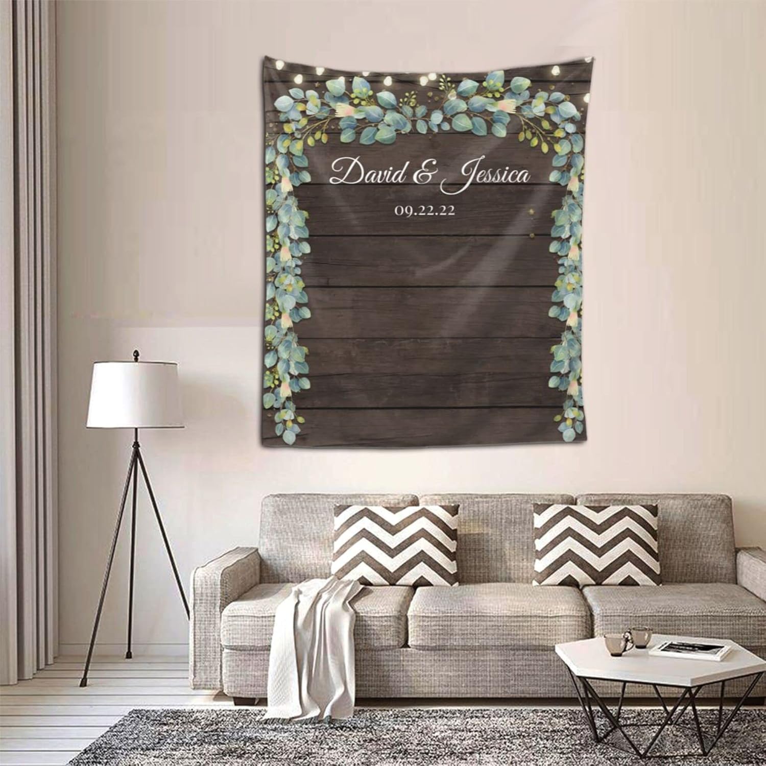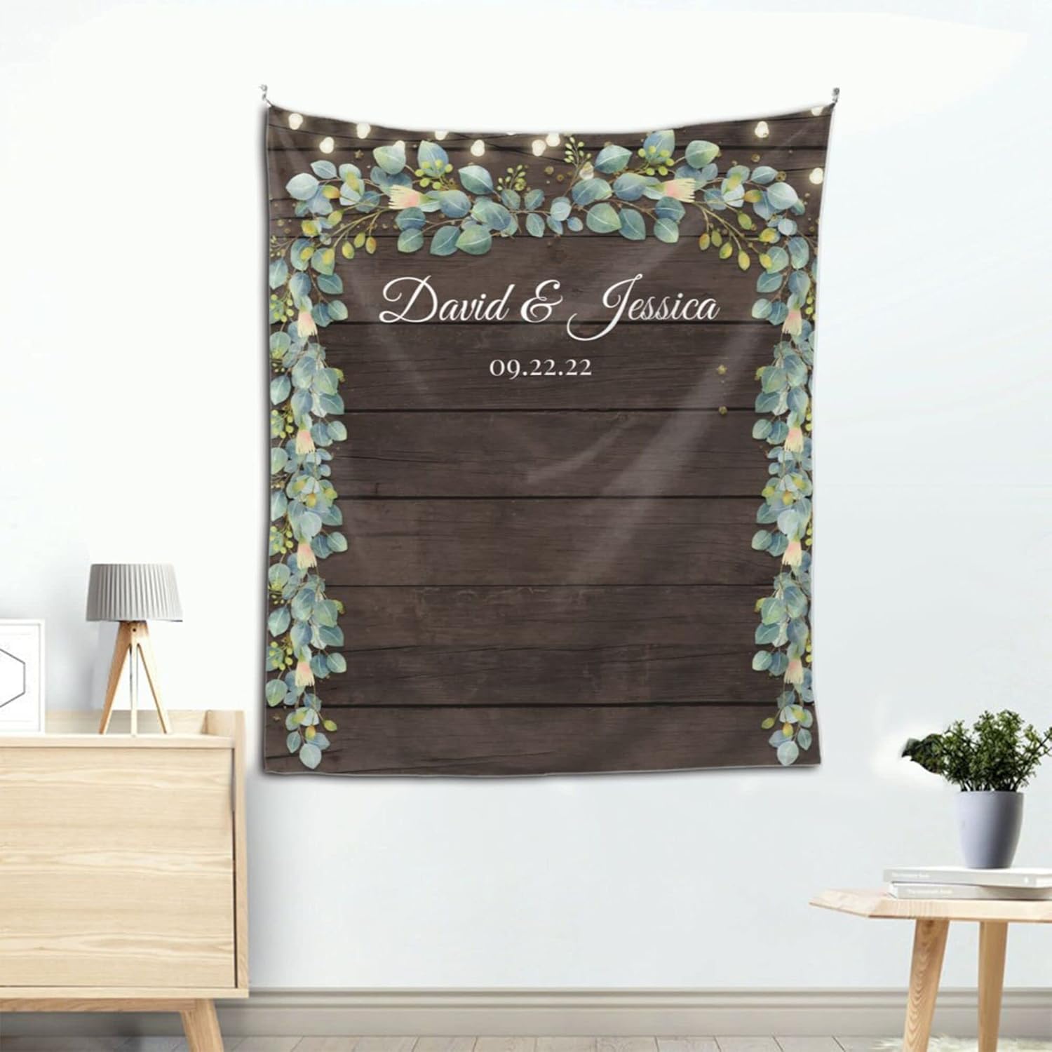 Wedding Backdrop for Reception, Rustic Wood Green Leaf Banner, Custom Tapestry with Names & Date, Personalized Calligraphy Banner Ceremony, Botanical Lights One Size
