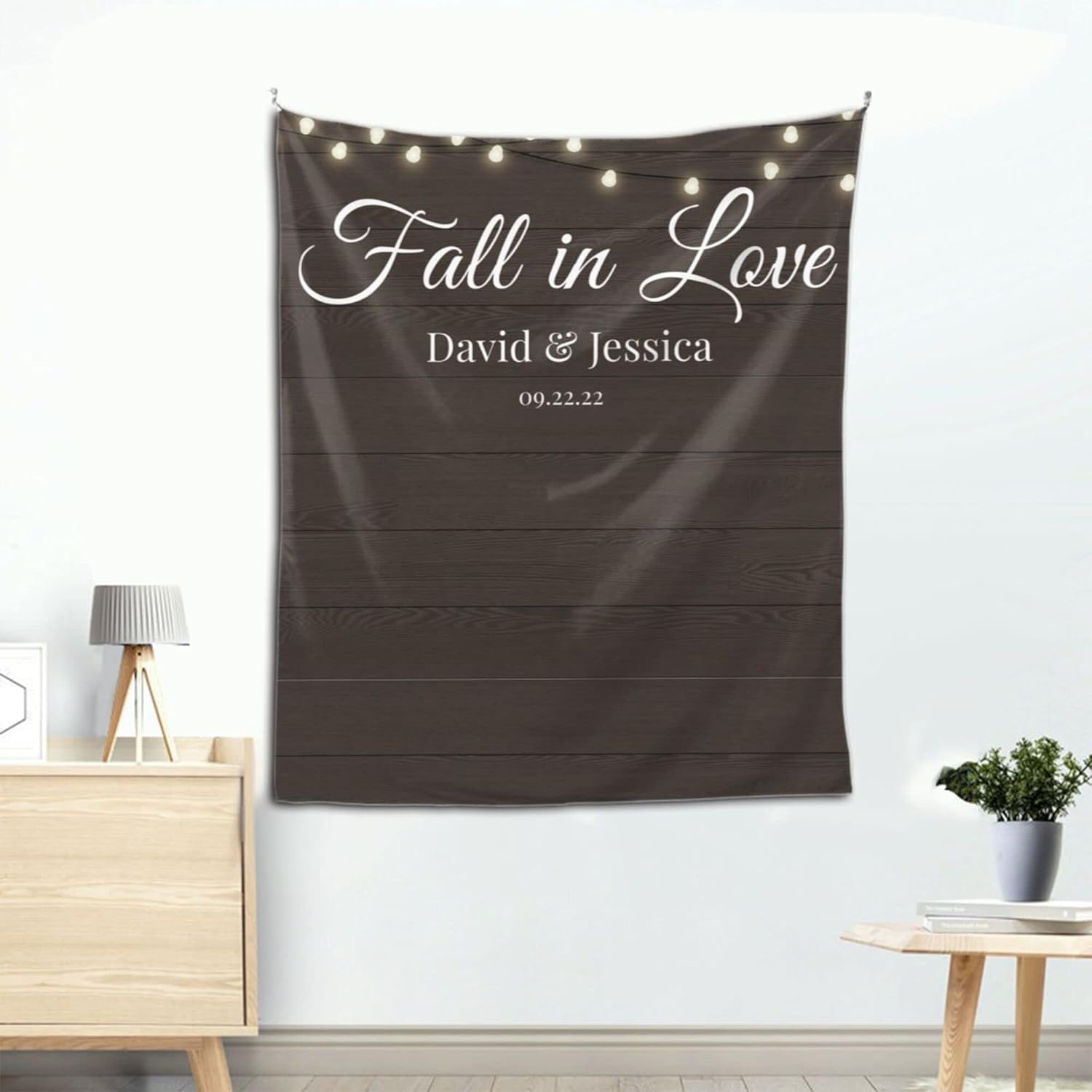 - ❤Add Your Own Design: Fall in Love Backdrop - Customized your own wedding quote banner with your names and your big date. Click 'Customize Now' to start your design, then you will get a unique and beautiful tapestry for your big day! Some customers like to change the fonts, if you also need that, you can leave a message or send us the font name or font photo directly, we will try to find the same font or similar ones.