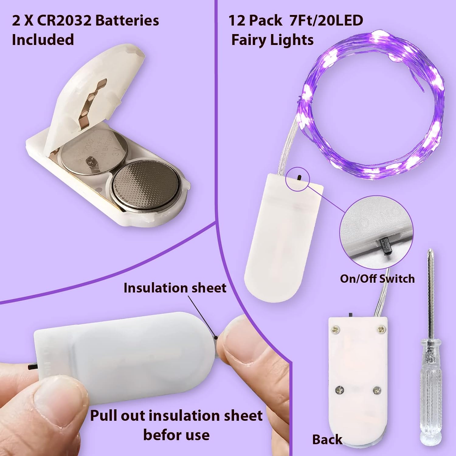- ăFantastic Purple Lightsă: 12 separate mini fairy lights battery powered, made of 7ft high quality Silver coated copper wire, Itâs flexible, strong and durable. Perfect for your crafts project , floral arrangements plants, signs, furniture glass jars, vases, wine bottles or other decorations.