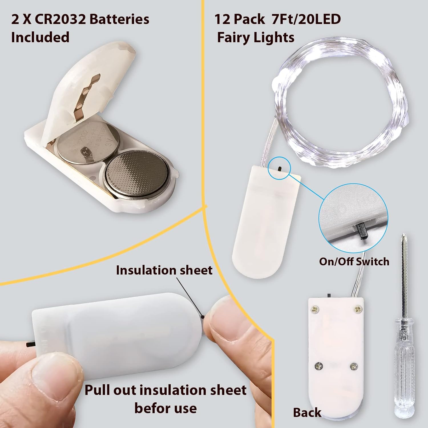 - 【Battery Powered】: Each set of lights powered by 2X CR2032 batteries( included and can be replaced). Although these support more than 72 hours continuous working, the actual use time will vary with the temperature and humidity of the environment. Small battery case (2*1 inches) is with on/off switch, very easy to hide into your design works. These are great for themed parties, sleepovers, or center pieces. Screwdriver included for easy operation.
