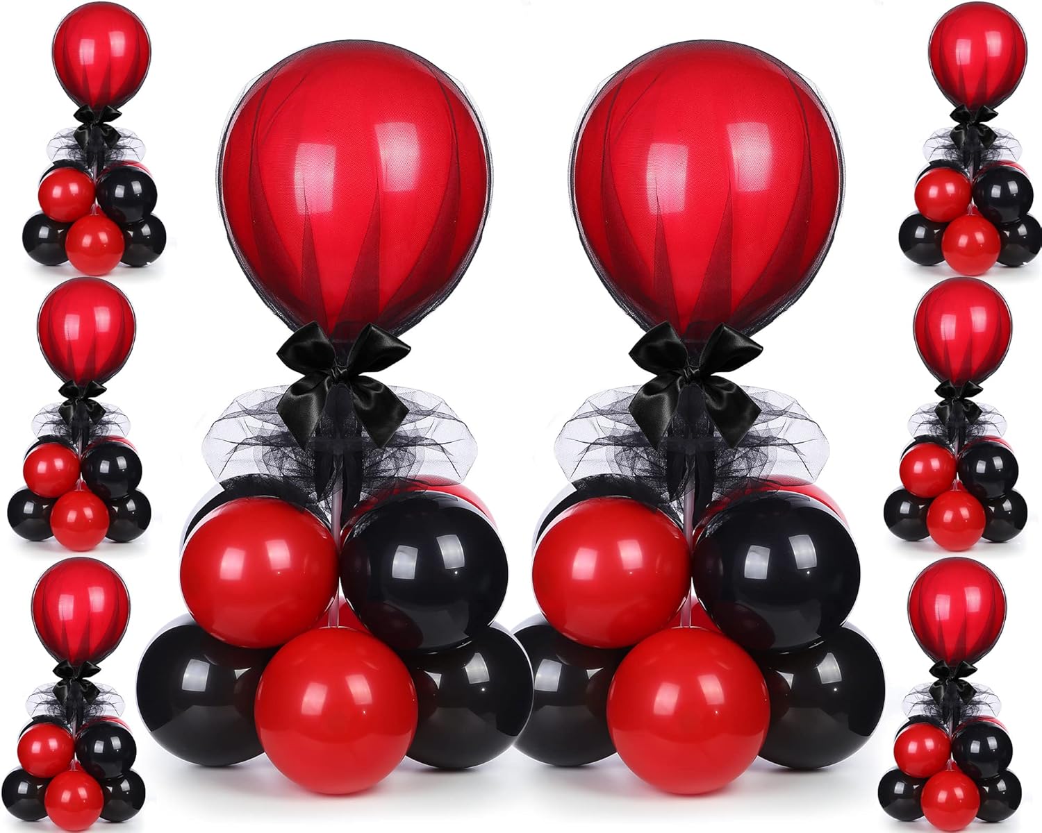 - What You Get: you'll receive a nice value balloon pack that includes 8 reusable tabletop balloon sticks, 8 balloon flower bases, 16 round snaps, 8 black gauze covers, 8 balloon fixed holders, 72 pieces of 5 inch latex balloons (36 black and 36 pomegranate red), 8 pieces of 12 inch pomegranate red latex balloons and 8 pieces black thick ribbons. Please note that the color will be closer to the picture after inflated