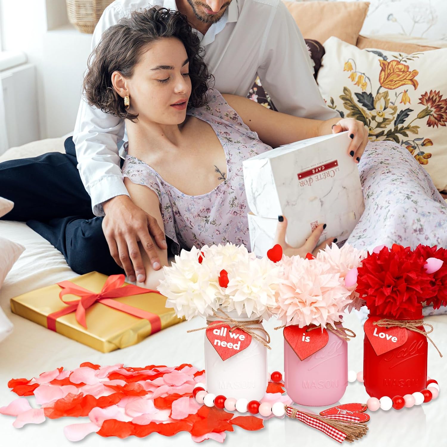 - ❤️Valentine's Day Mason Jars: The package is equipped with 3 Valentine's Day Mason bottles with artificial flowers, 3 love wood chips, 1 string of hemp rope, 10 heart decorations, 1 decorative wood chips, 1 string of wood beads, and 2 packages of petals. These lovely decorative Mason jars will bring a warm atmosphere on Valentine's Day. Be sure to add perfect colors to your Valentine's Day or wedding celebration!