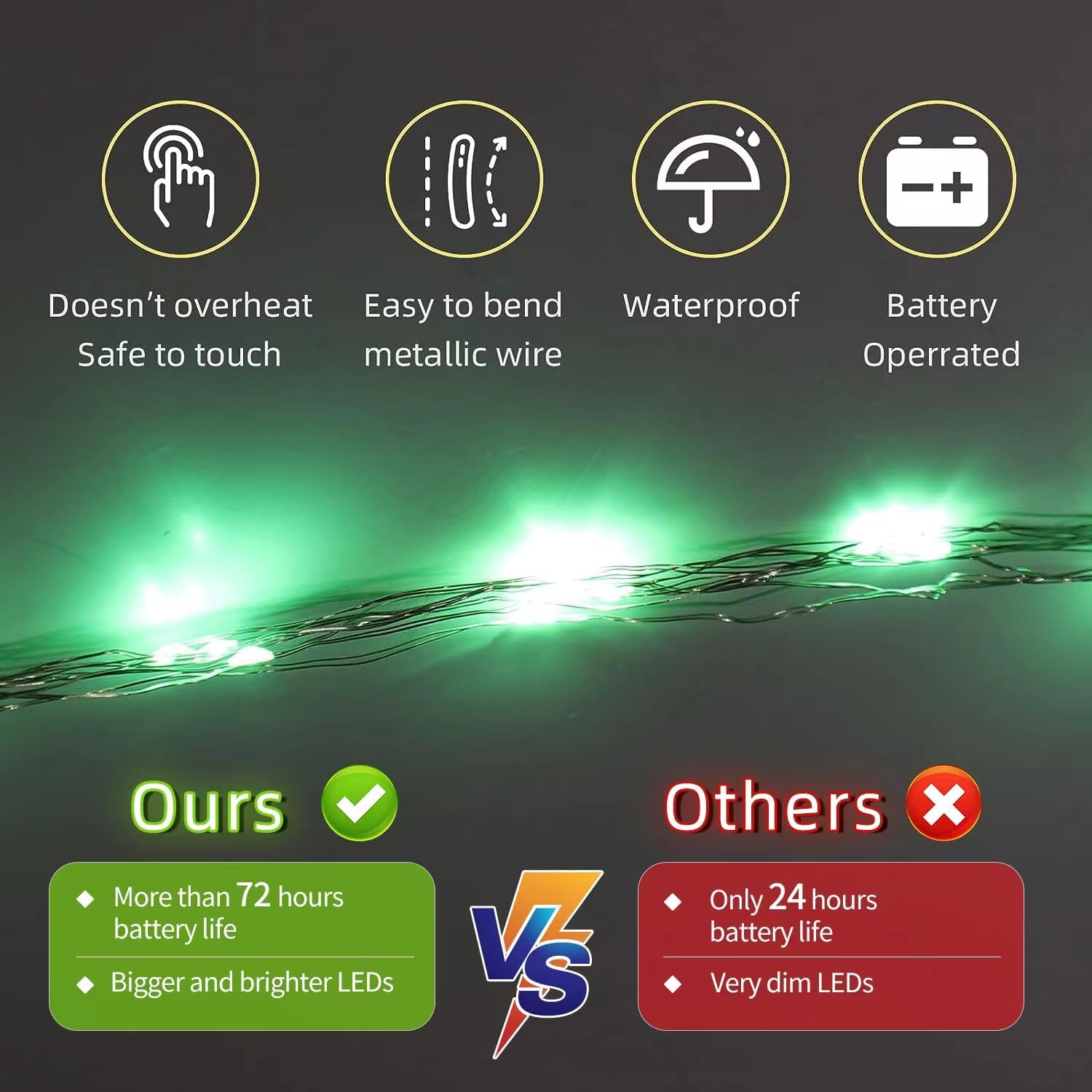 - 🌟【Long lasting batteries】The battery operated mini string lights pre-installed long life batteries,offering 72 hours constant use and will be longer if use with breaks; Comes with a mini screw driver ,very convenient for you to replace batteries.The battery compartment size is 2*0.87inches,each with a very small ON/OFF switch ,which is portable ,super easy to operate and hide.