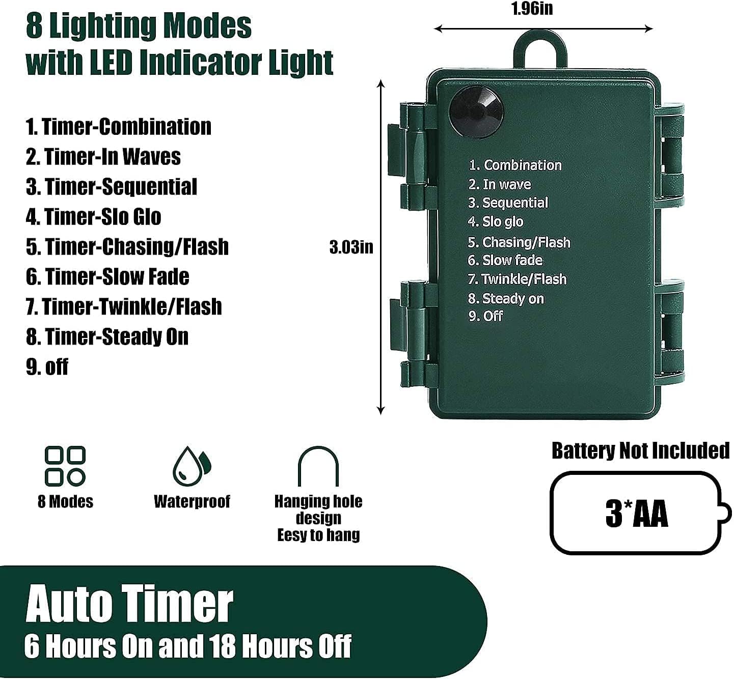 - β 8 MODES & AUTO TIMER: 8 Modes of Lighting and Flashing Effect, Combination, In wave, Sequential, Slo glo, Chasing/Flash, Slow fade, Twinkle/Flash, Steady on. Auto timer with 6 hours on and 18 hours off.Our string lights have built-in auto timer function.Timer function is integrated into the lights.