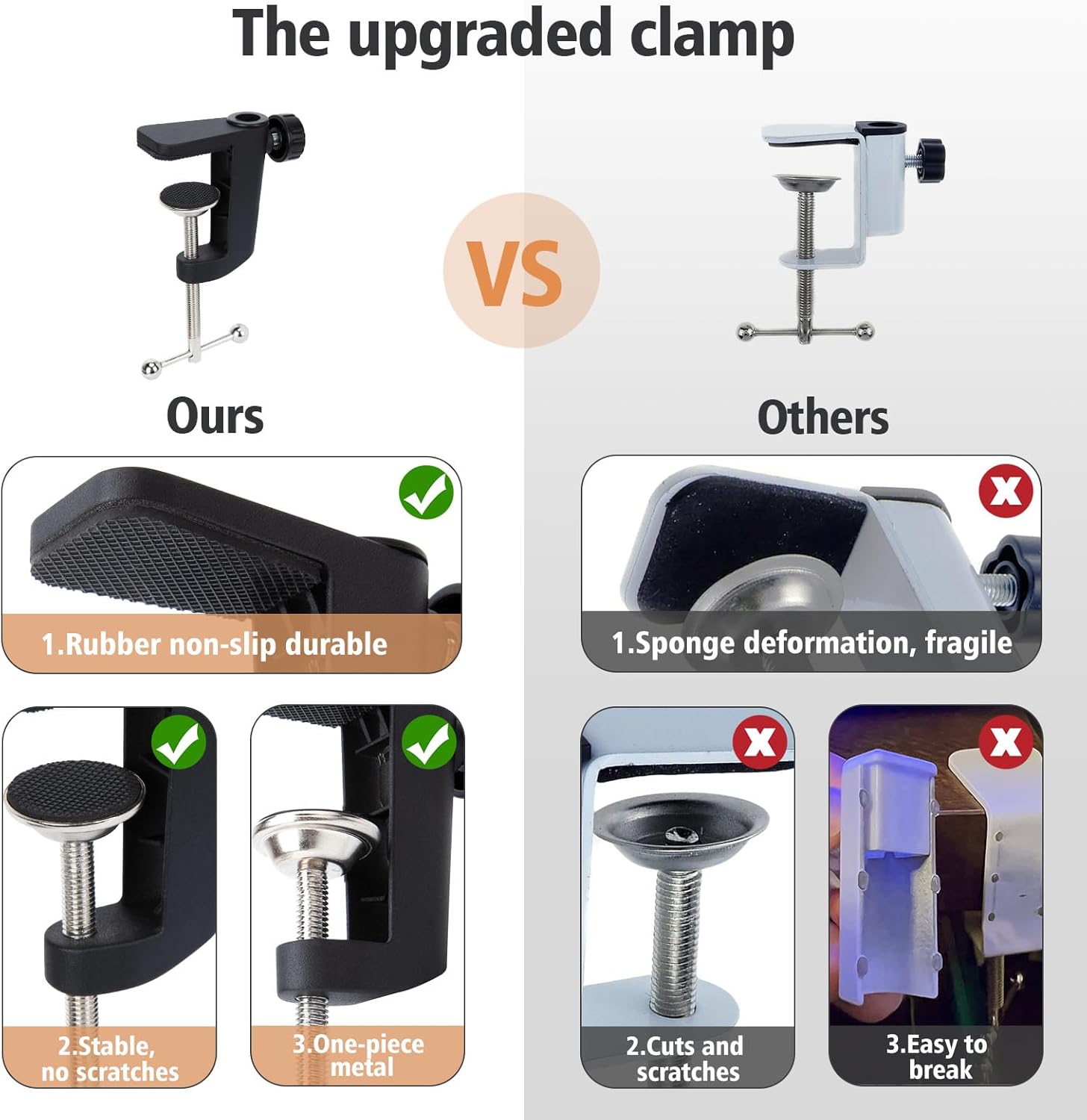 - 【Table Clamp Base】- Suspension boom arm comes with one desk clamp, can easily clip to any desktop up to 1.8"/4.5cm thick. The sponge on the mic stand desk base could protect your desk without any scratches when you swivel side screw.