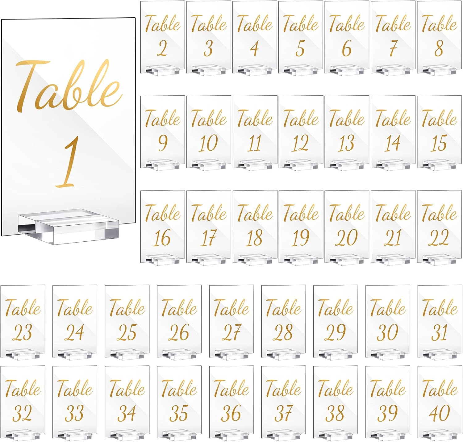 - Number and Calligraphy Prints: the acrylic table numbers are printed with 1-40 numbers and calligraphy, and their gold is particularly beautiful against the clear acrylic, simple and elegant, modern and simplified, suitable for various weddings and table themed parties