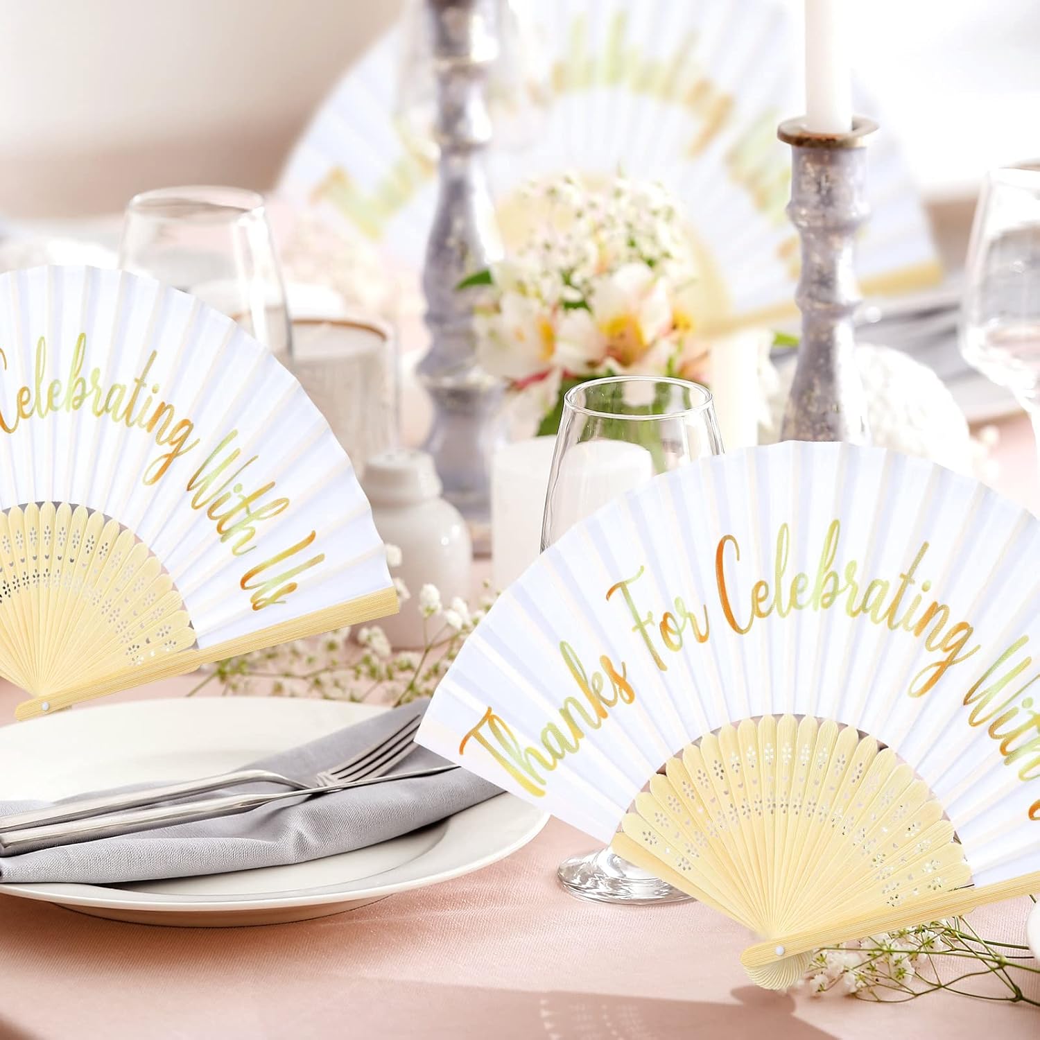 - Sufficient in Quantity: you will receive 50 pieces folding fans hand held, each printed with the text [ Thanks for Celebrating with Us] , which are sure to be well received by guests as quality gifts for them; These wedding folding fans will also cool everyone off at a summer party