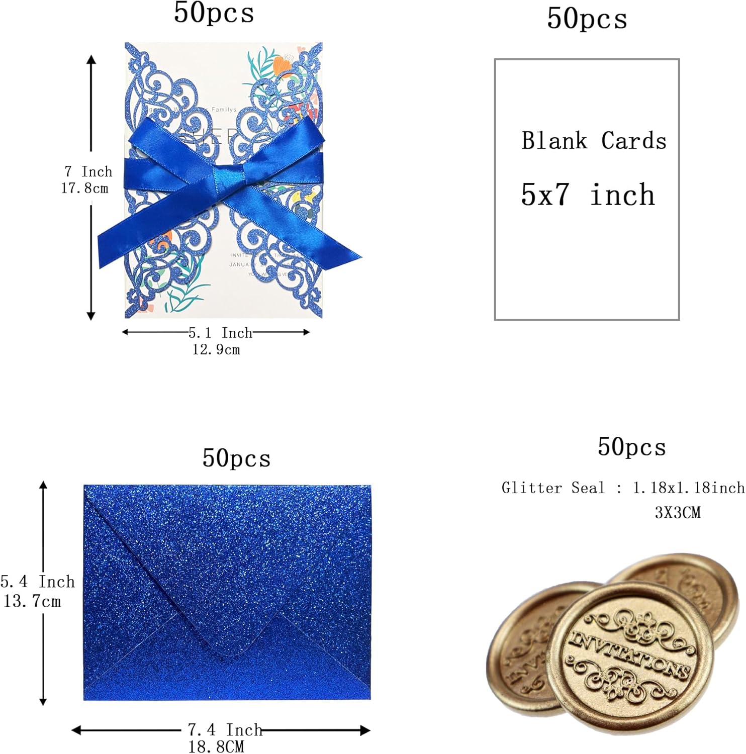 - 【Package include】50Pcs laser Cut Invitation Cards, 50Pcs A7 Glitter Envelopes, 50Pcs Inner Sheets (default blank),50 PcsIvory Blue ribbons, 50Pcs Gold envelopes seals.