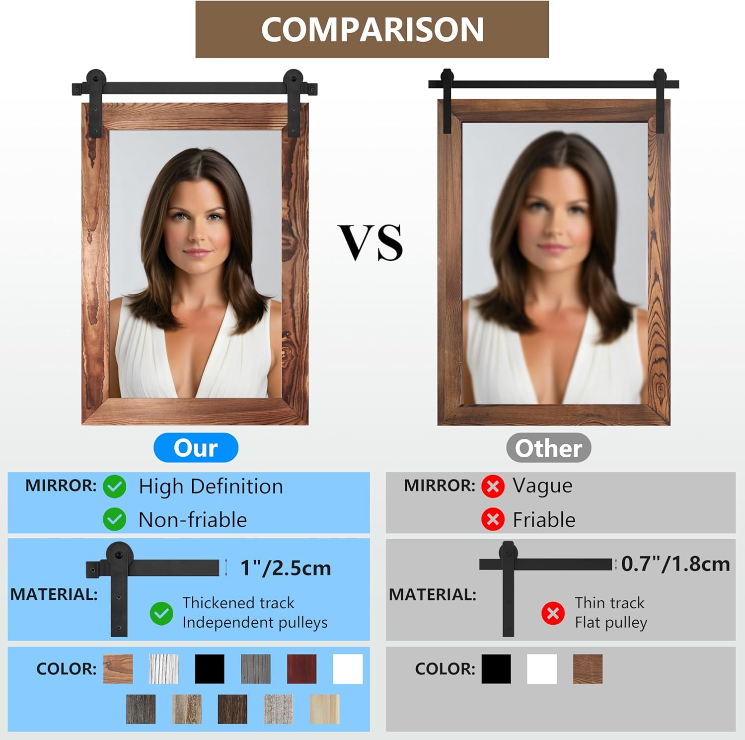- QUALITY MATERIALS: The frame of the barn door mirror consists of an antique solid wood frame and a sturdy metal bracket. The interior features a 4mm HD silver mirror with clear and distortion-free reflections, providing a better sense of light and projection in your space
