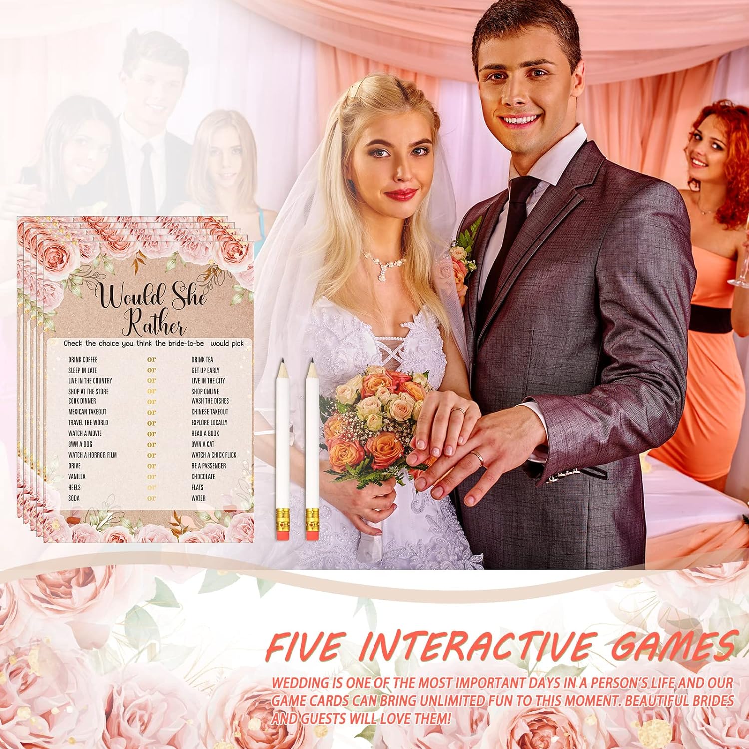 - 5 Styles of Fun Bridal Shower Games: our game bridal shower cards contain 5 fun games, including "Would She Rather", "Bride Or Groom Guess Who", "Bridal Word Scramble", "Wishes For The Bride And Groom", "What's In Your Purse"; These cards provide your guests with a fun wedding game to help them fully enjoy the party and elevate the mood