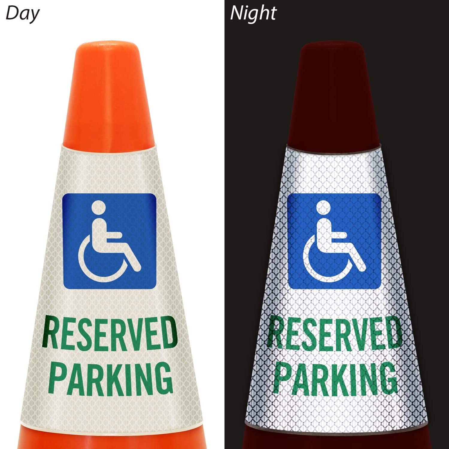 - DURABLE: ADA Reserved Parking Cone Sleeve signs for traffic/safety cones are made out of durable vinyl woven plastic. Easily turn any traffic cone to a portable sign. These are waterproof and weatherproof.