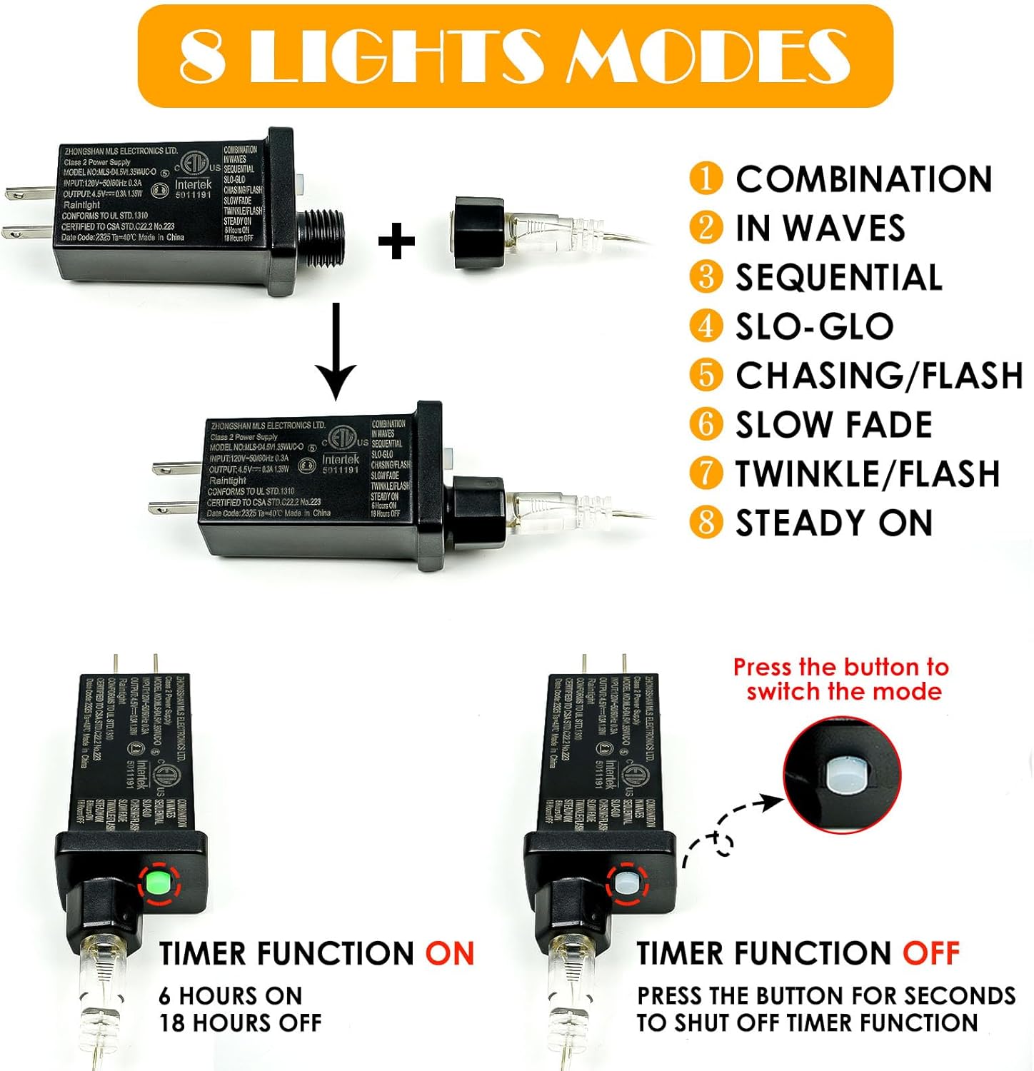 - Remote & Timer Function & 8 Modes & Memory Function: The remote string lights included a remote control for more convenient. Use the remote to change multiple modes: turn the lights on/off, choose from 8 lighting modes (combination, in wave, sequential, slo glo, chasing/flash, slow fade, twinkle/flash, steady on), set the timer (6 hours ON, 18 hours OFF) and adjust the brightness (10 brightness levels). This fairy lights could remember the setting of previous night you set.