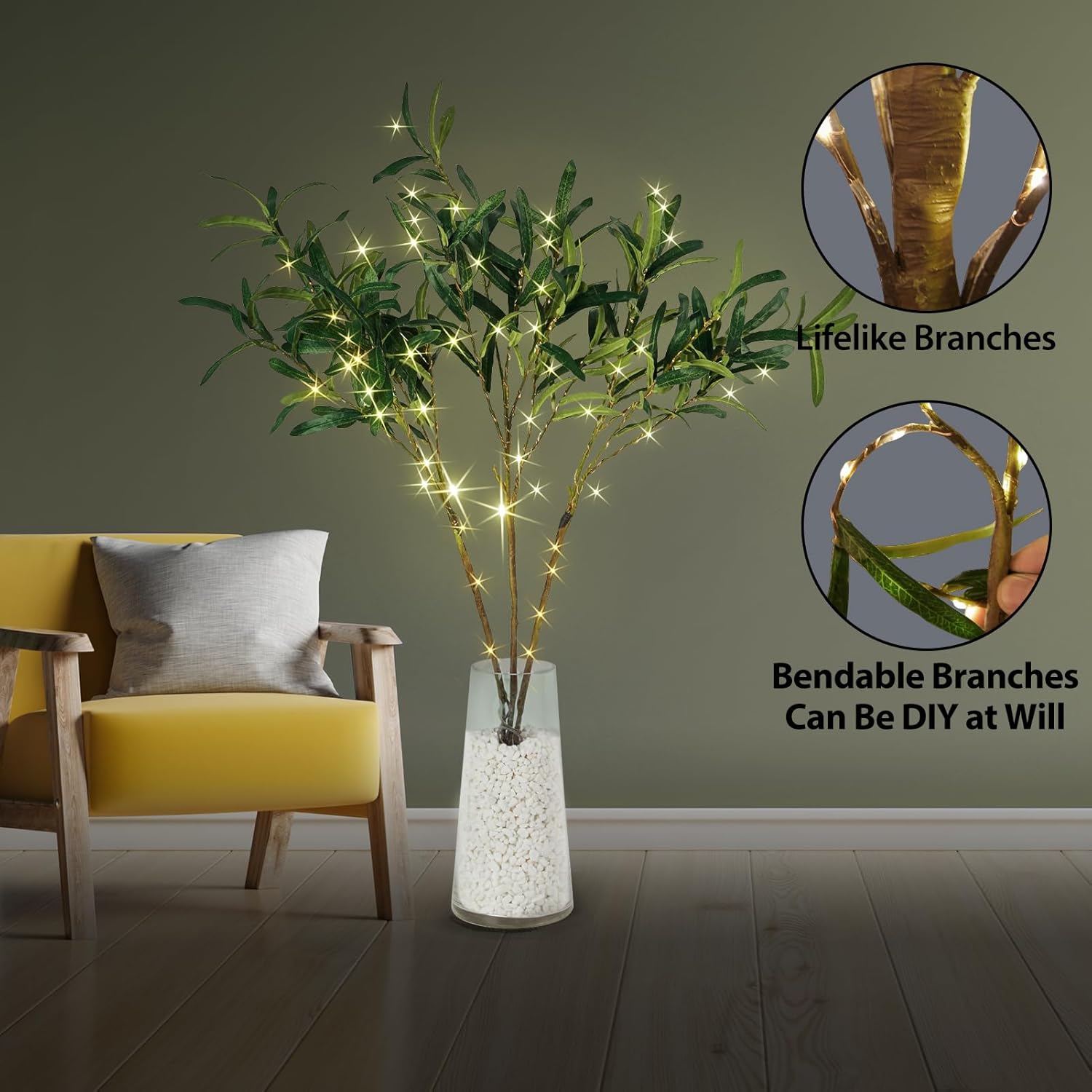 - 🎄【You can DIY】The olive-lighted tree branches are 33in high and contain 99 warm white LED lights. The texture of these olive trees' artificial indoor branches is soft and sturdy, it is easy to bend into any shape. You are free to DIY into what you want, you can also put some Christmas, Easter, and other festive decorations on the lighted branches to decorate it