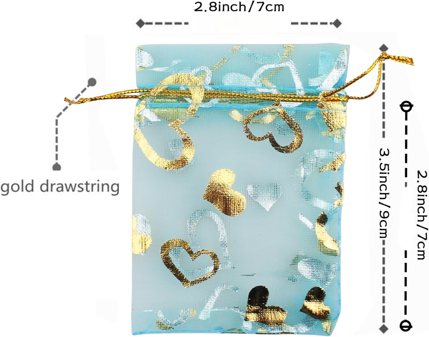 - PROPER SIZE&ENOUGHT QUANTITY: 2.8 x 3.5 inches=7 x 9 cm; Hand made and manual measurement with Β±0.2ββ error;Package includes 100 pieces of exquisite organza bags; The bags would come with a nice OPP bag for convenient storage.