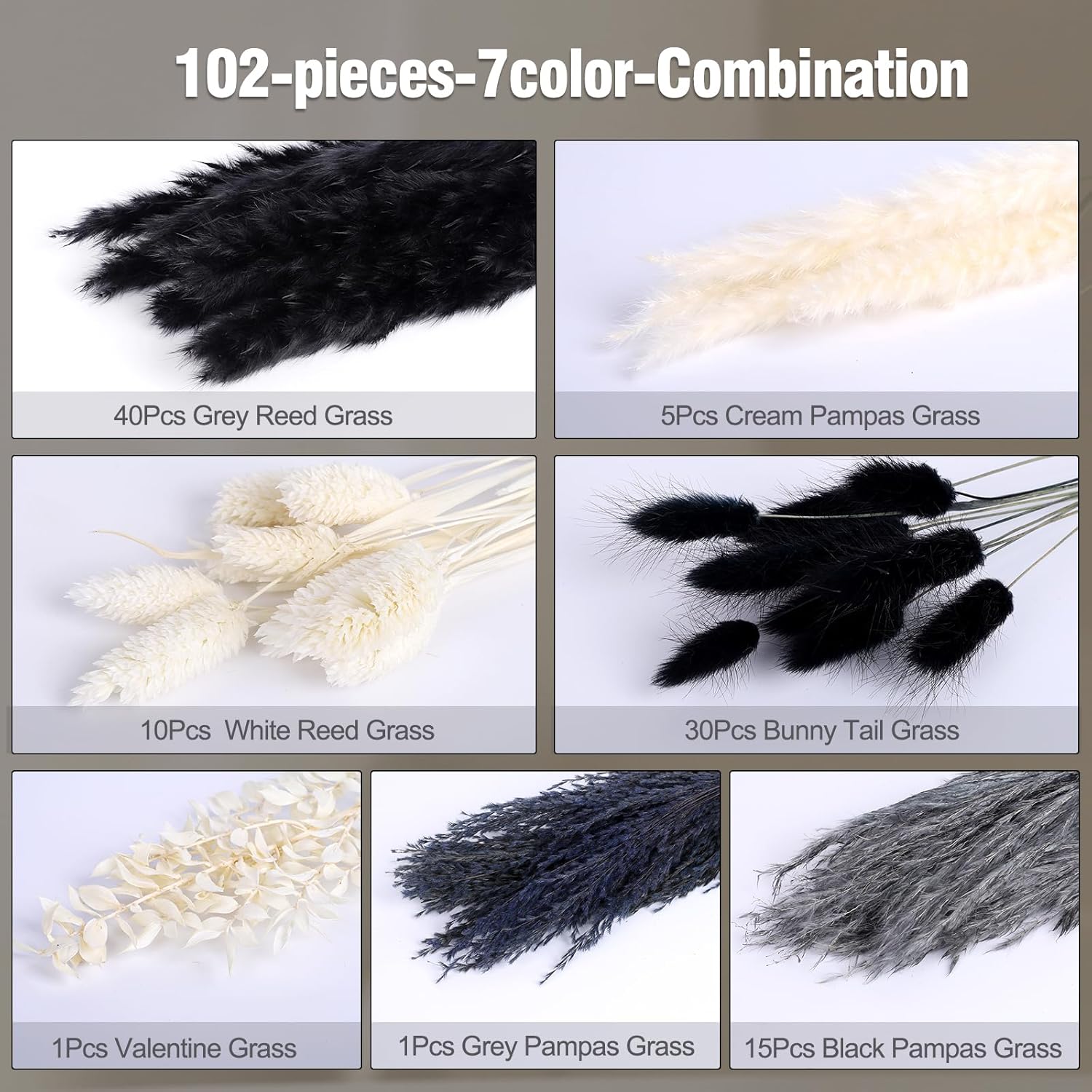 102PCS Black Pampas Grass Decor, Grey White Natural Dried Pampas Grass Bulk, Boho Home Decor Bouquet, Black and White Dried Flowers Decor, Halloween Wedding Floral Arrangements Vases Decorations