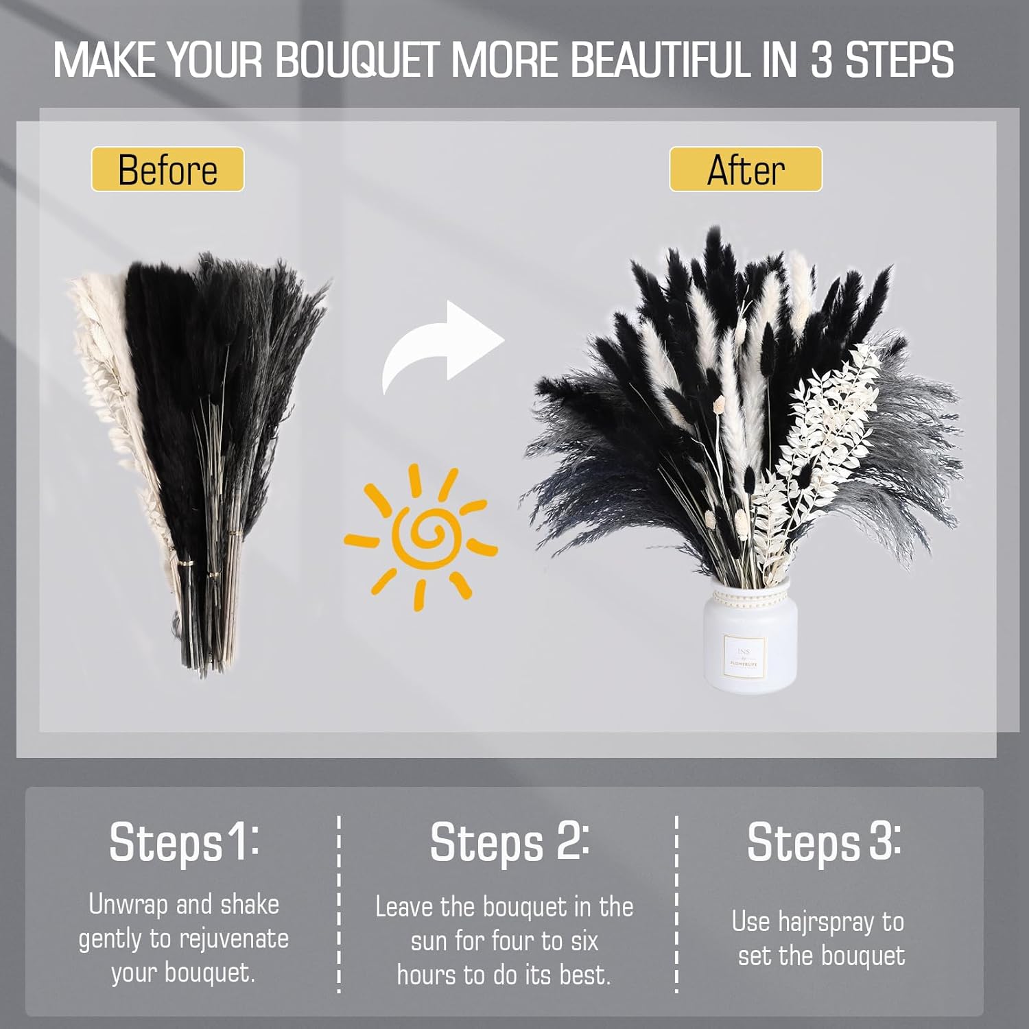 - HOW TO FLUFF UP NATURAL PAMPAS GRASS: Shake each stem carefully to remove excessive fur and help the plumes open. Leave the stems in the vase for 24-48 hrs with sun - your dried pampas grass decor will get back to their natural form and will become even fluffier over time.