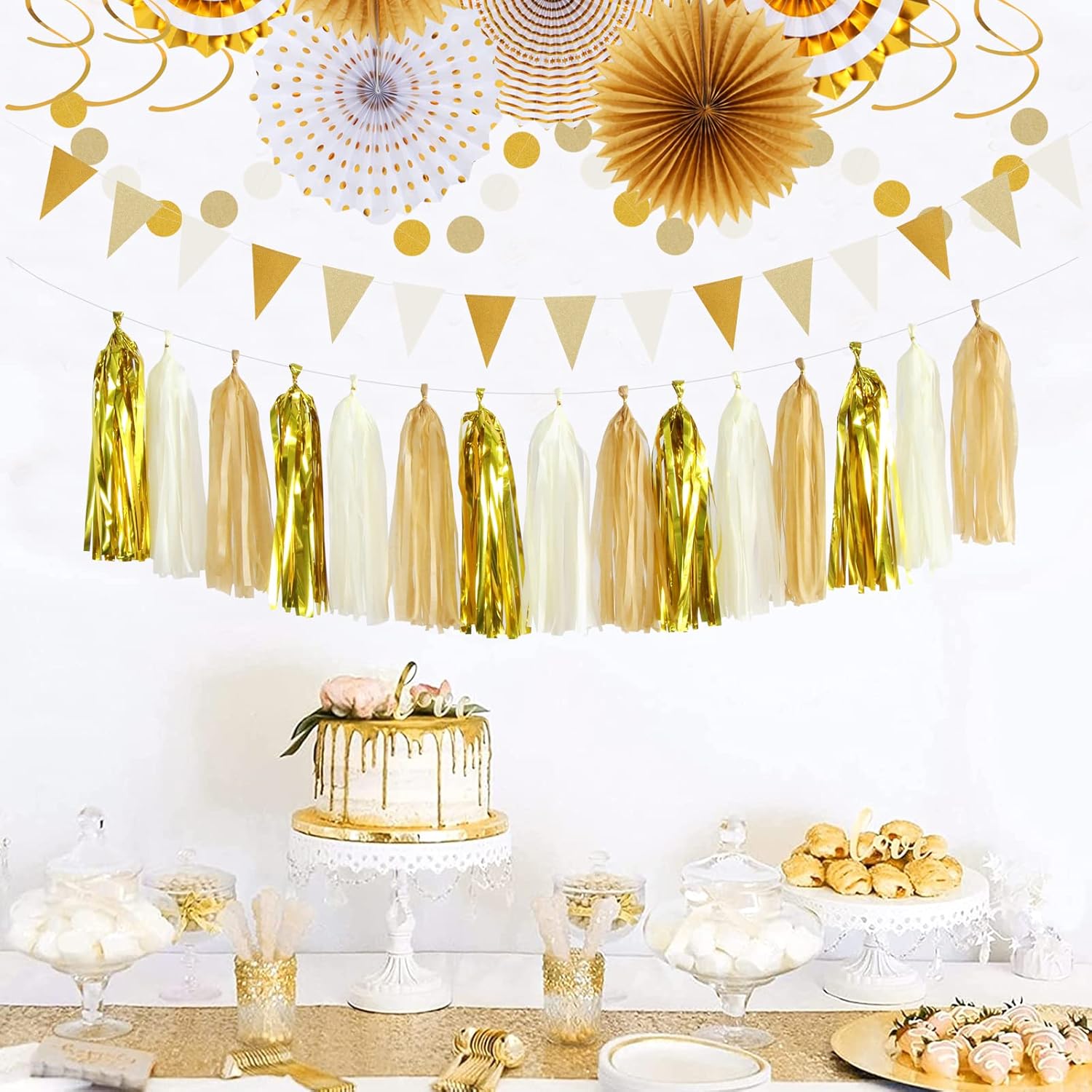 - Package Including:The white gold party decorations 1pcs paper garland dots,1pcs Triangle Flags in ivory gold champagne,15pcs tassel garland,2pcs 8” honeycomb ball,6pcs gold streamers swirl,4pcs 10” paper lantern fan in three color,3pcs 12”paper lantern fan in three color,1pcs 16”paper lantern fan.