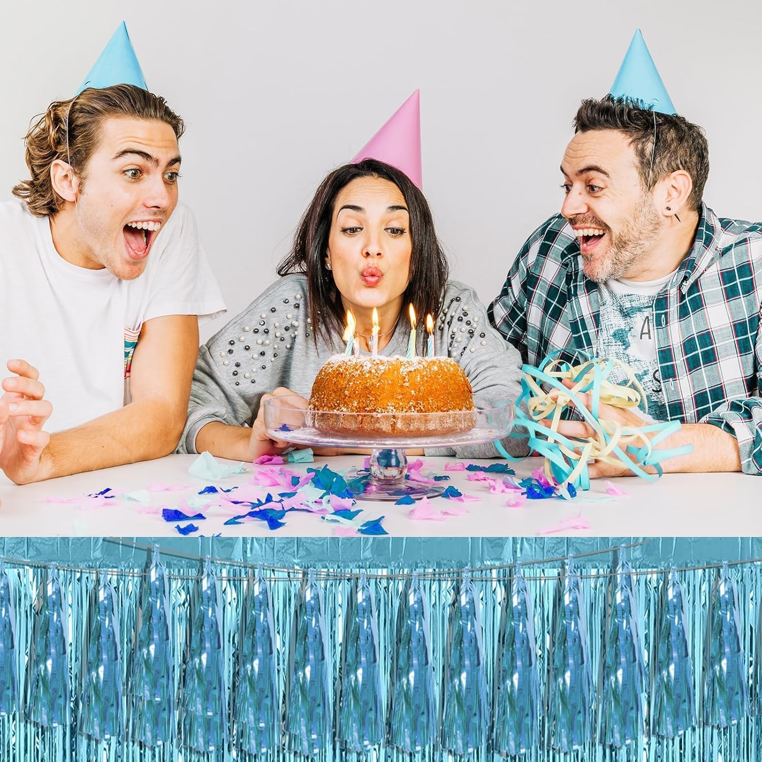4P Light Blue Foil Fringe Metallic Streamers Banner Tassel Garland for Parade Floats, Bachelorette, Wedding, Birthday, Halloween, Christmas, Bridal/Baby Shower Party Decorations