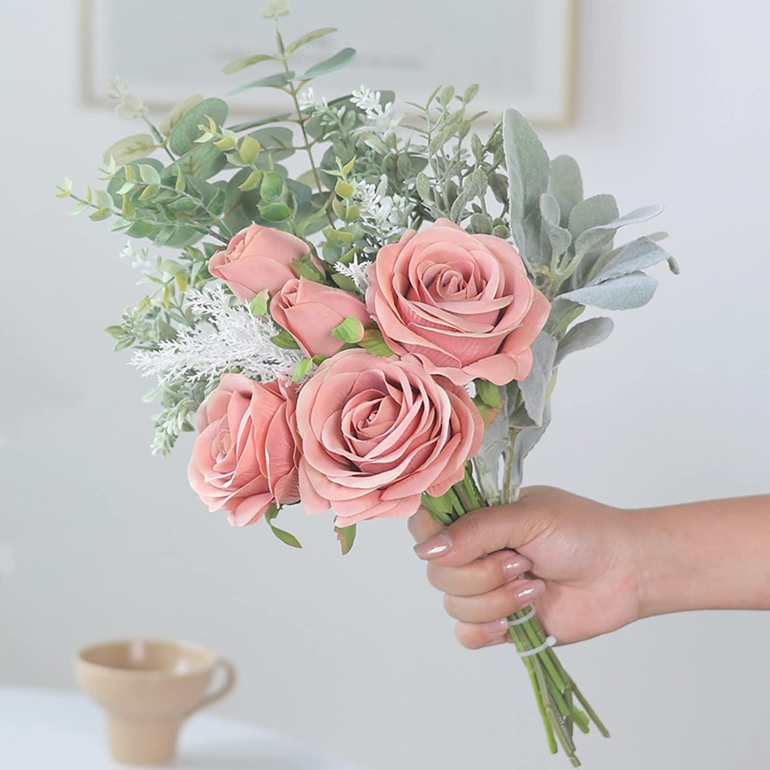 - Quality Materials: Bouquets are made purely by hand by skilled florists, artificial flowers are made of fine silk and artificial plants are made of plastic. The stem of the bouquet is plastic wrapped in wire. You can adjust the stem of the bouquet to unfold by hand when you receive it, so that the bouquet looks more fluffy and beautiful.