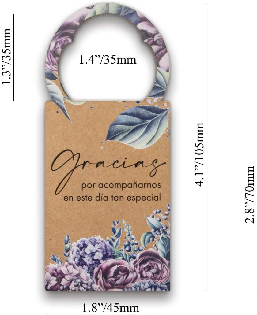 - The tags are made using 250GSM (170lbs) premium quality shimmering gold card stock. Each tag is printed with the wordings "Gracias por acompañarnos en este día tan especial".