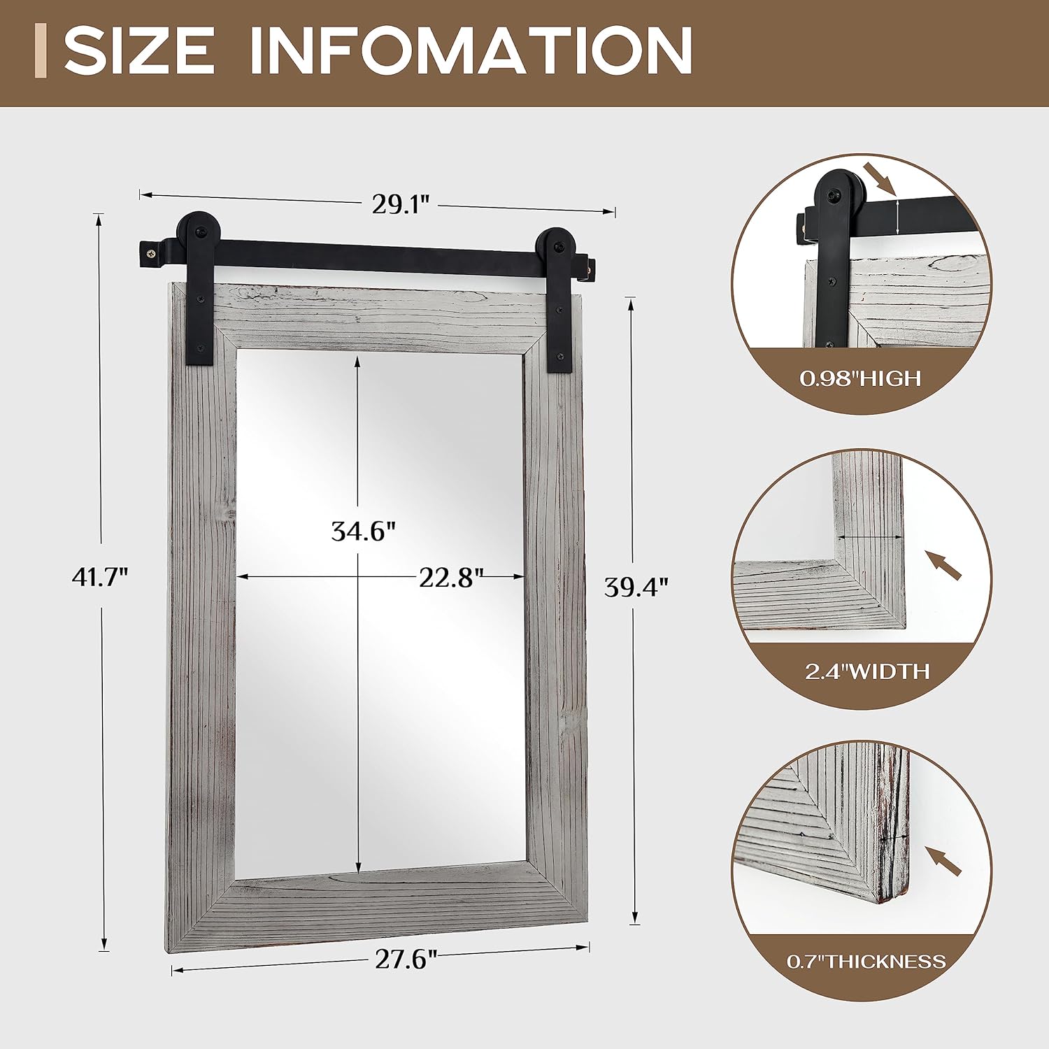 - EASY TO INSTALL: The overall size of this rustic mirror is 41.7 x 29.1 x 0.67 inch, and the display size of the mirror is 34.6 x 22.8 inch. The track is 29.1 inch. You can first fix the iron bracket on the mirror, then install the track on the wall, and finally the wheels on the iron bracket will be stuck into the track to complete the hanging