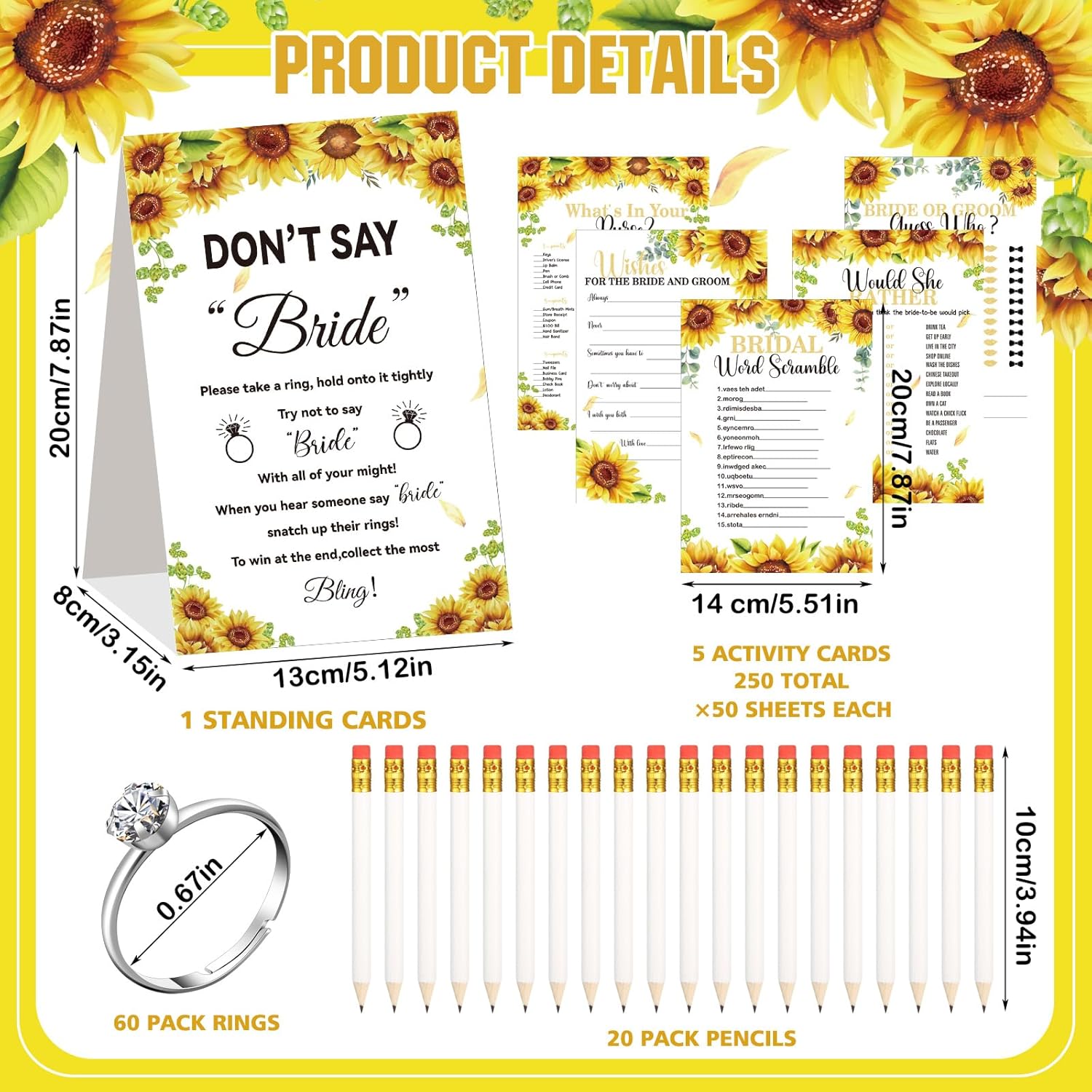Estune 331 Pcs Bridal Shower Games Supplies, 5 Sets 250 Pcs Wedding Cards 1 Put a Ring on It Bridal Shower Games with 60 Rings and 20 Pencils(Sunflower Style)
