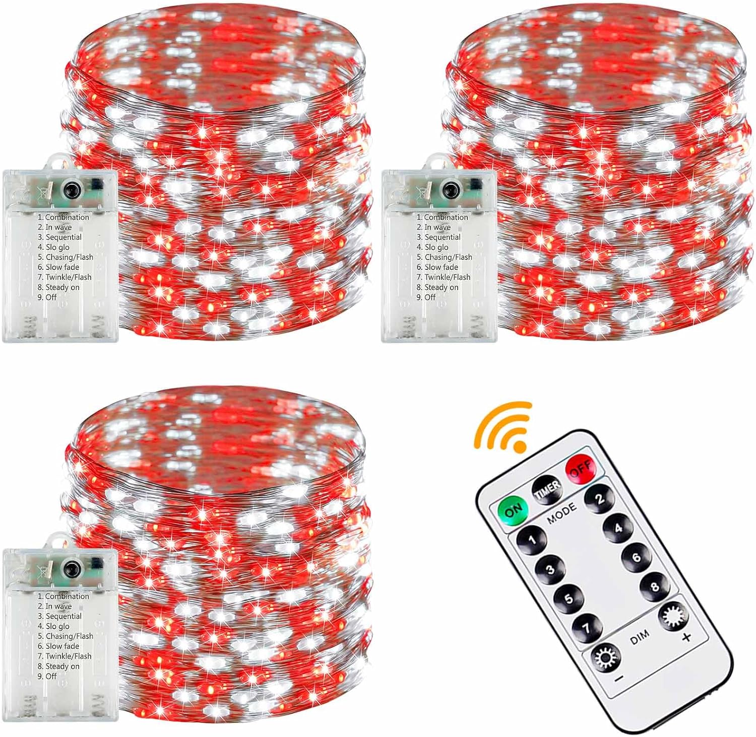 3 Pack Fairy Light Battery Operated with Remote Control Timer, 26 FT 80 LED String Lights Outdoor Indoor, 8 Mode Twinkle Lights for Christmas Party Wedding Birthday Bedroom Decoration (Red and White)