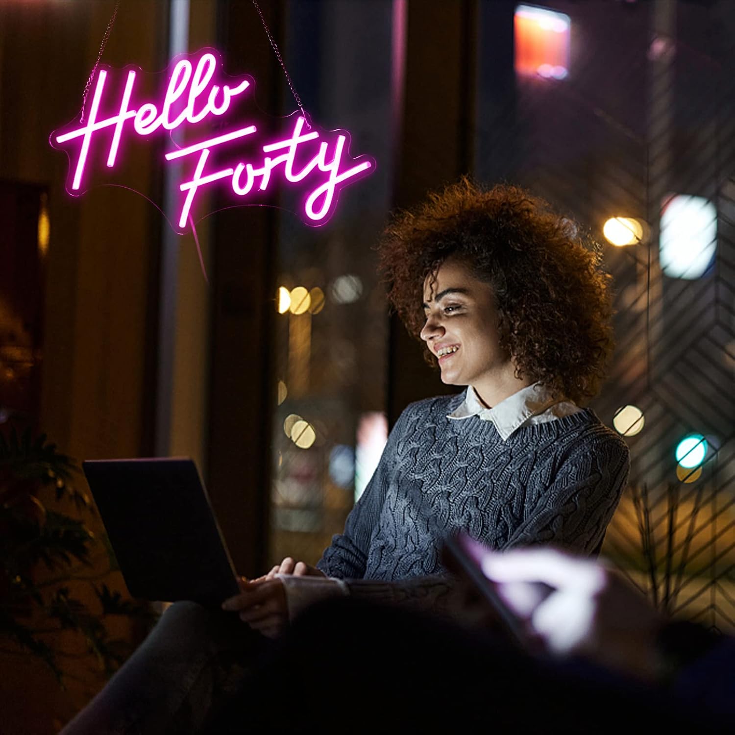 - 【Best Room Decor】-- The size of the hello forty neon sign is 24cmx42cm/9.4inx16.5in. Turn on the led neon lights, and the dreamy pink lights fill every corner of the room. Pink glow neon sign brings you positive energy and courage. A 40 year old girl is brave, beautiful, and confident, Welcome to a better life.
