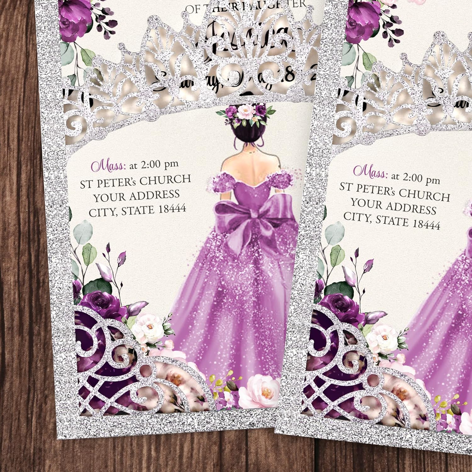50Pcs Purple Crown Invitations for Quinceanera, 15 year, Sweet 16, Miss XV, Birthday Laser Cut Quince Invitation Cards Personalized Glitter Silver