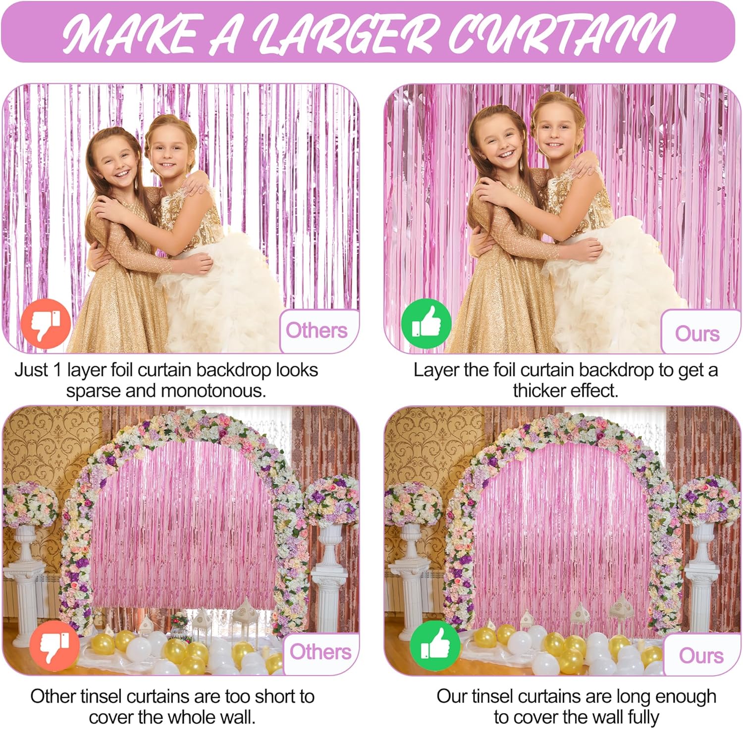 Crosize 4 Pack 3.3 x 9.9 ft Pink foil Fringe Curtains Party Decorations, Pink Tinsel Curtain Backdrop for Parties, Door Streamers, Glitter Streamer Fringe Backdrop for Birthday Decoration