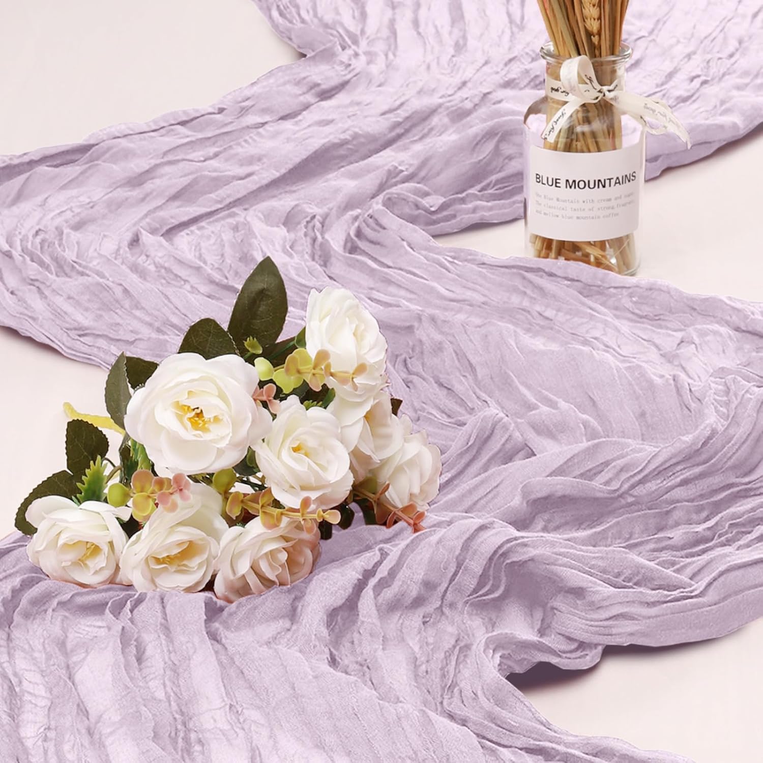 - 【Soft Material】: Made of high quality polyester, soft to touch, comfortable and durable. Wrinkled design cheese cloth farbic, delicate edges and stitches, adopts seamless technique makes this sheer table runner more graceful than traditional fabrics. Our cheesecloth wedding table runners are durable, the colour stays for a long time, does not fade and can be reused.