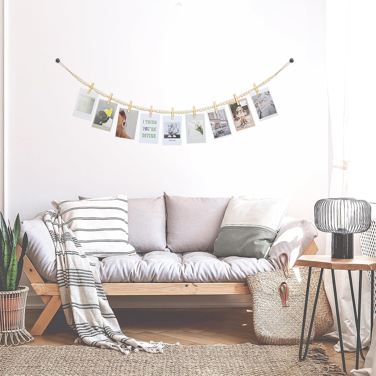 Hanging Photo Display Wall Decor, 3PCS Boho Wooden Bead Garland Collage Picture Frame with 9 Wood Clips for Bedroom, Living Room, Office, Dorm Decor, Photos Holder Teen Girl Gifts