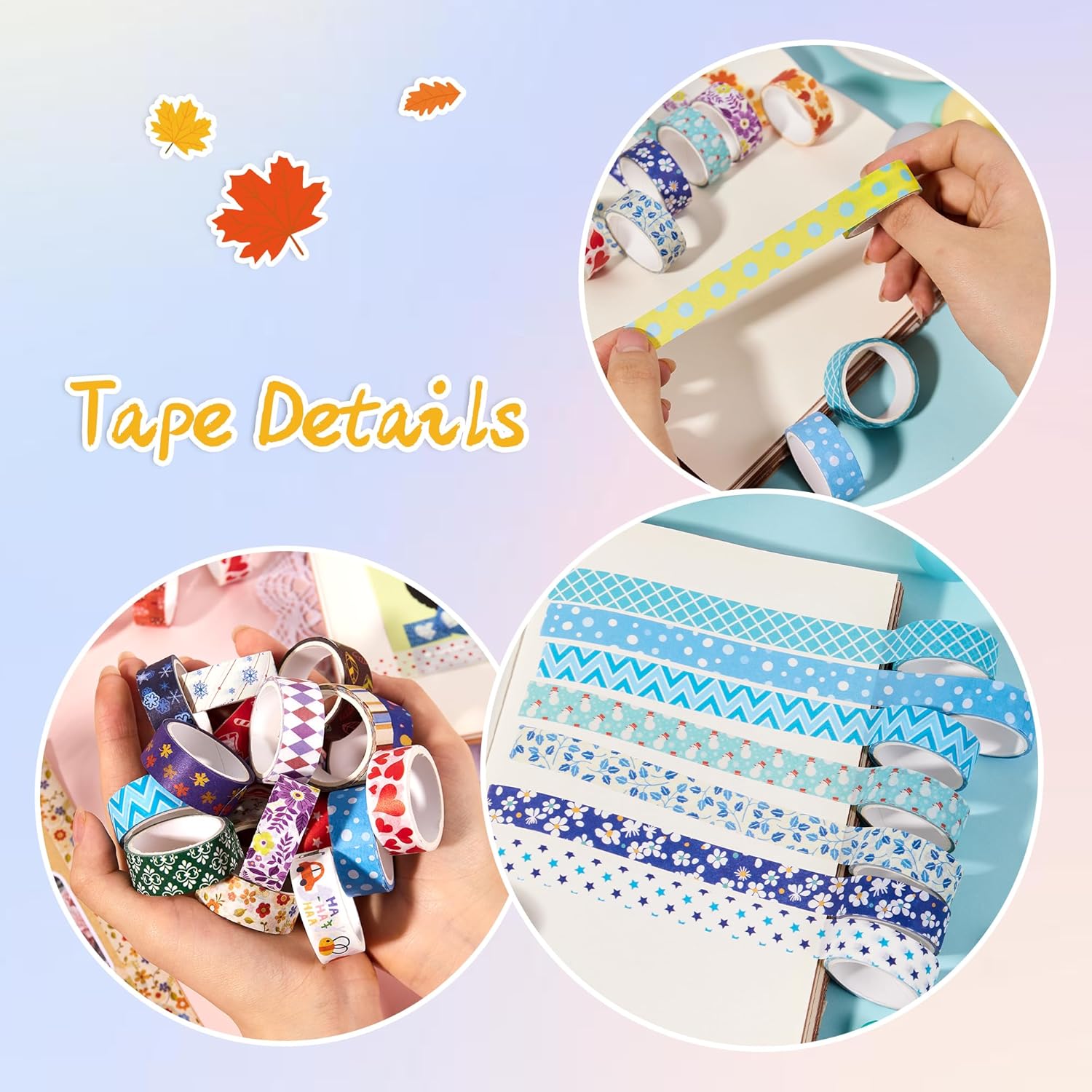 - 🌈Colored washi tape set includes 50 rolls with different patterns: 0.6 inch(15mm) wide x 10 feet(3m) long,total 492.1 feet(150m). This Colored washi tape adds color and vitality to the pasted items, making daily life more interesting.