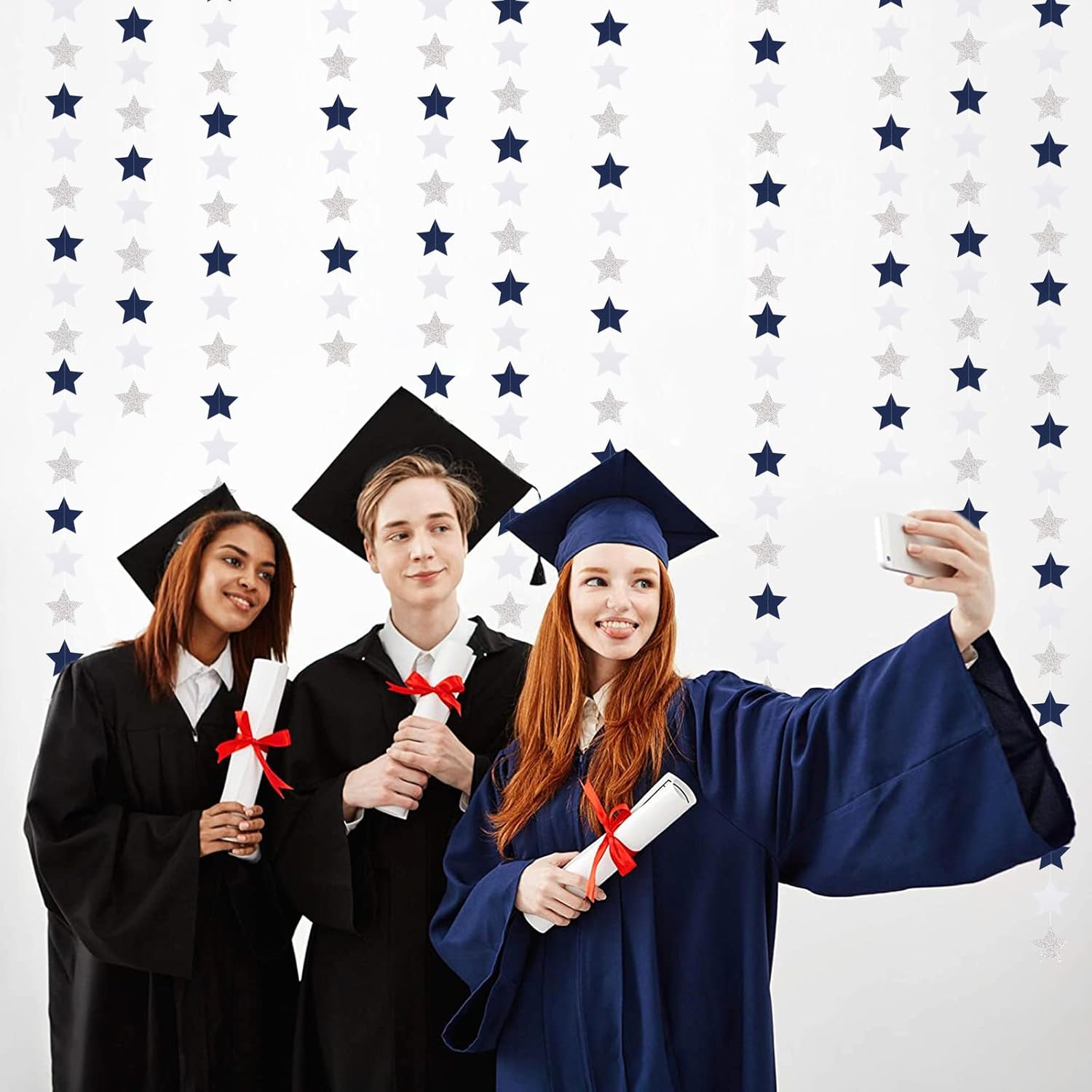 - PACKAGE CONTAINS: This set has 4 navy-blue white-silver paper star garlands,the length of each strand is 4.7 meters/11.5 feet, the total length is 18.8 meters/62 feet.