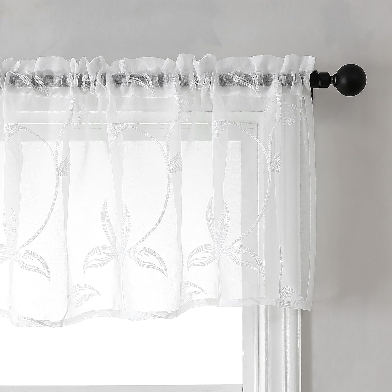 VISIONTEX Sheer Voile Curtain Valances, Decorative Leaves Embroidered, Rod Pocket Window Treatment for Kitchen/Rustic Bedroom/Living Room (54 x 16 Inch,1 Panel)