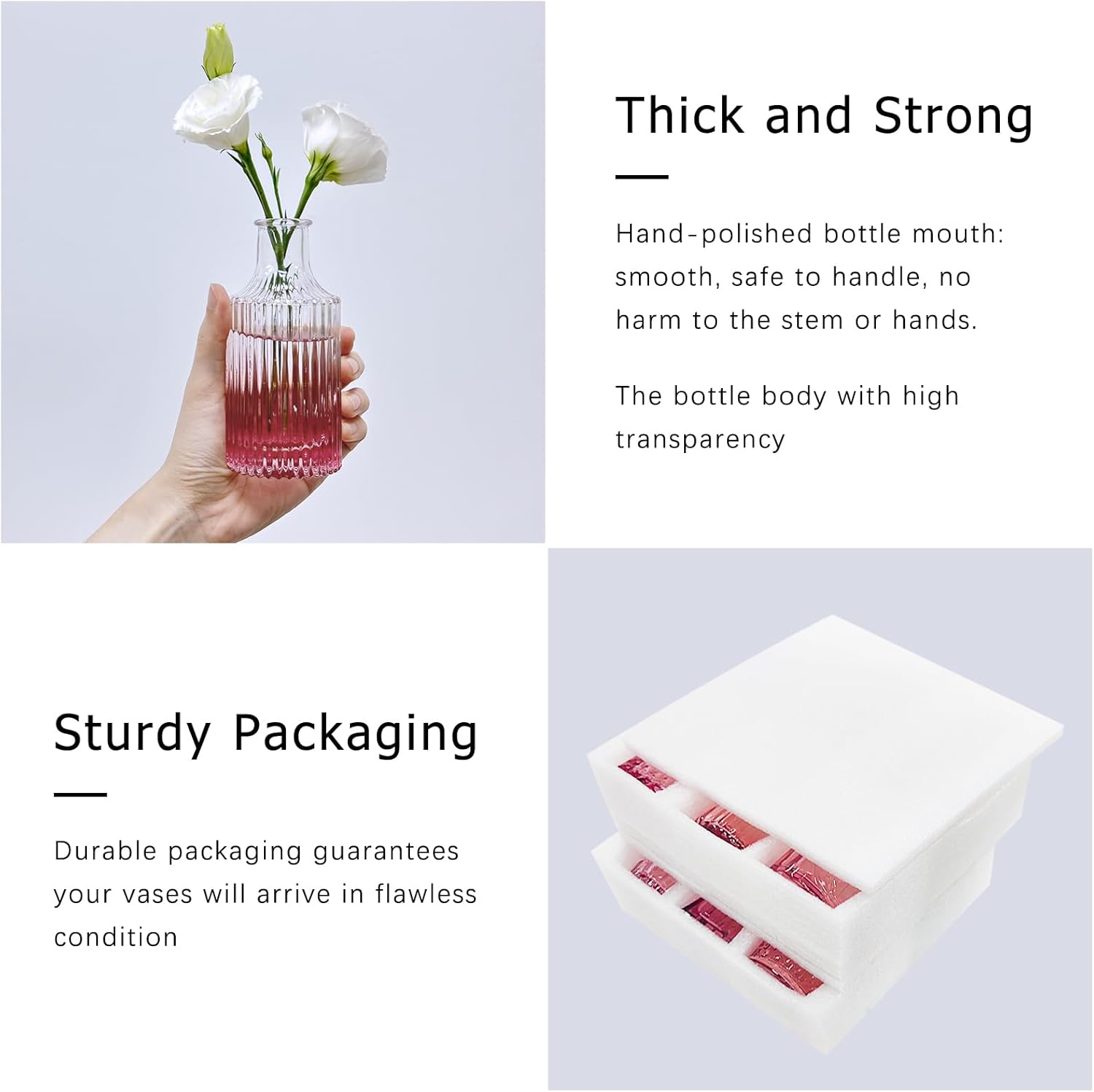 - SAFE & SECURE PACKAGING: Your satisfaction is our priority! To ensure these mini vases reach you in perfect condition, we have specially designed packaging. Each vase is carefully wrapped in thick Styrofoam boxes, to avoid breakage in transportation. If you receive a damaged vase, reach out to us immediately.