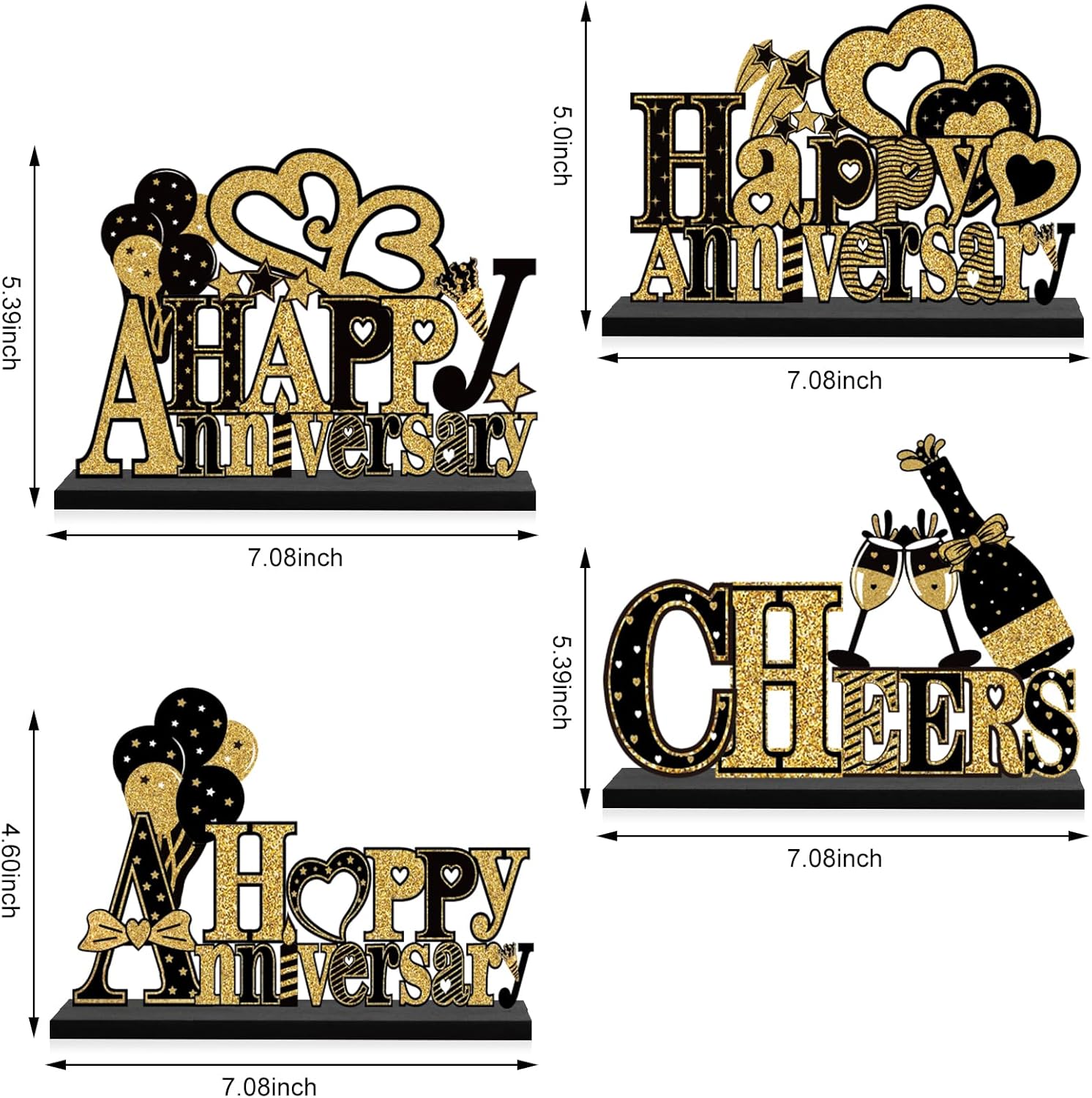 4 Pieces Anniversary Decorations Wooden Table Centerpieces, Black Gold Happy Wedding Anniversary Table Sign Party Supplies, 10th 20th 30th 40th 50th 60th Anniversary Table Decor for Indoor Outdoor